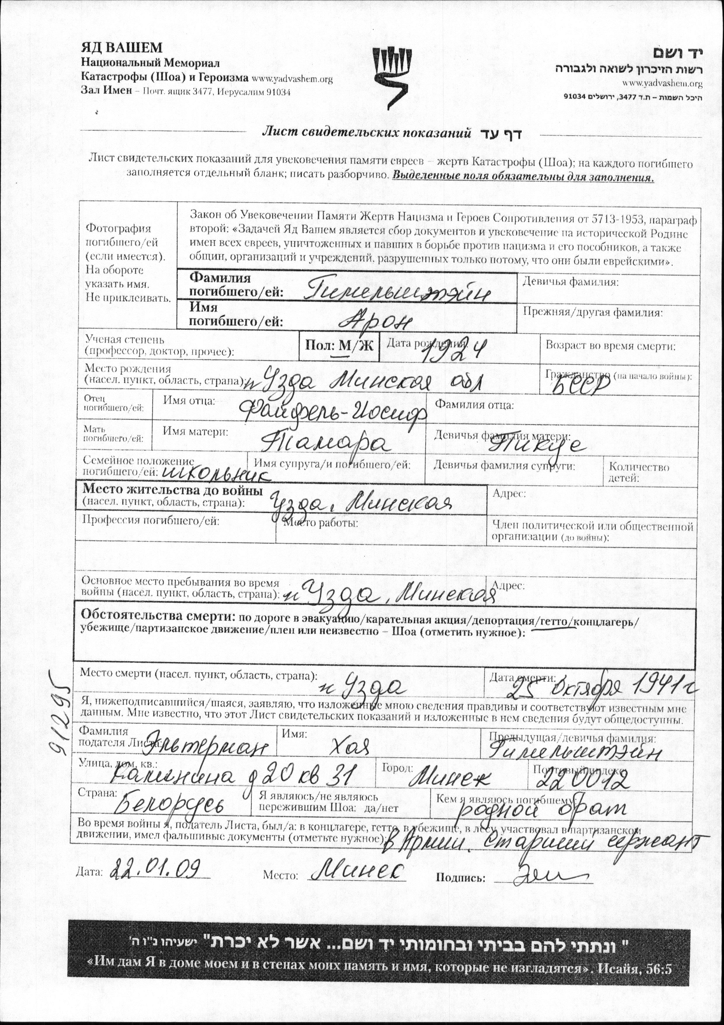 Gimelshtein Aron 1924 Uzda, Bélorussie (URSS) Feuille de témoignage