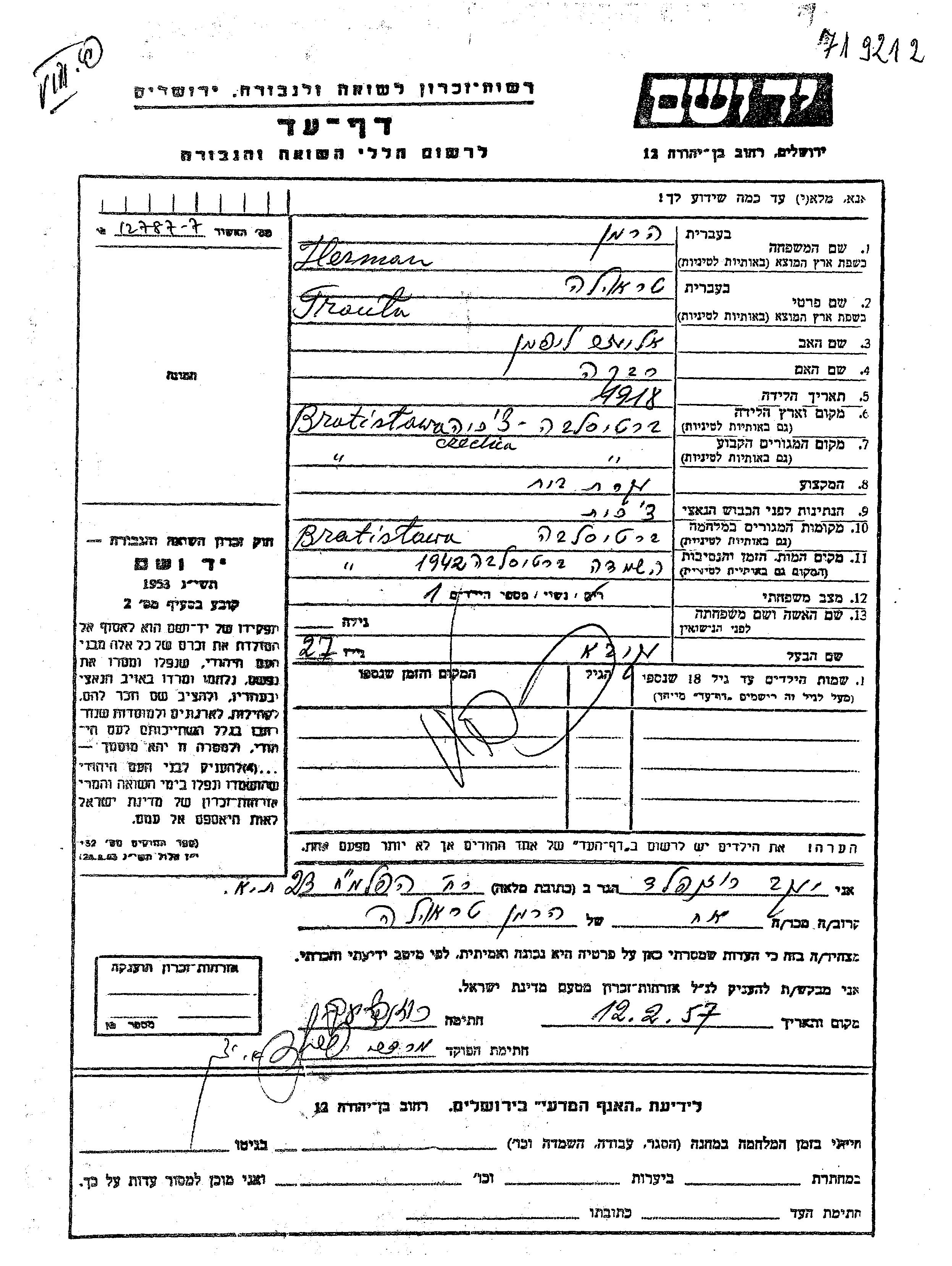 Herman Traula Gertruda 1918 Bratislava, Tchécoslovaquie Feuille de témoignage