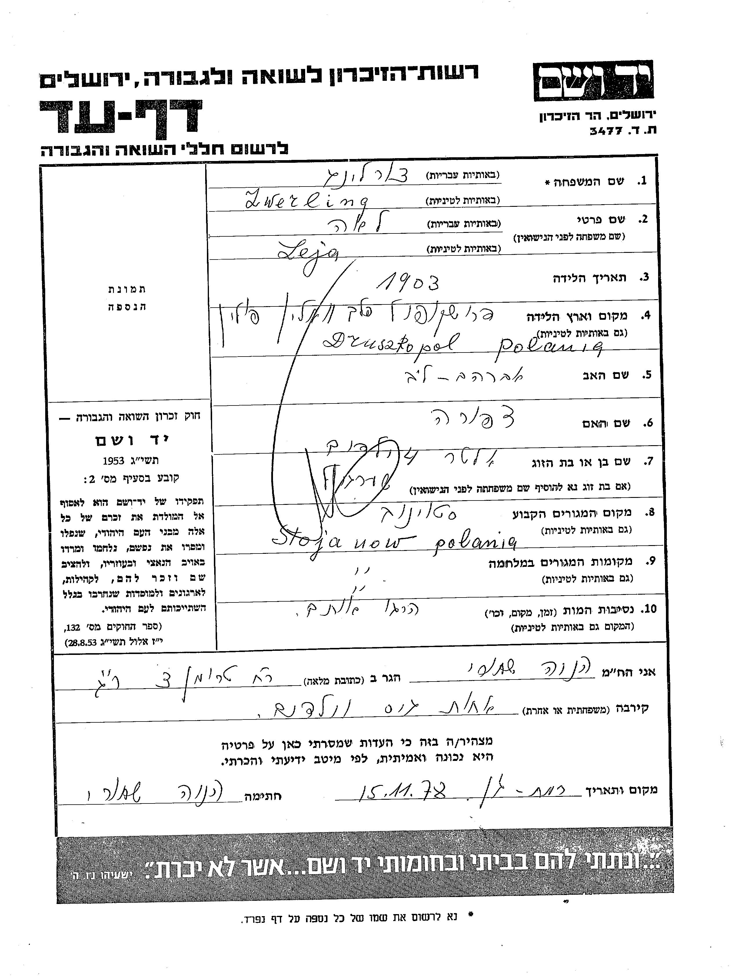 Yad Vashem - Pages of Testimony Names Memorial Collection