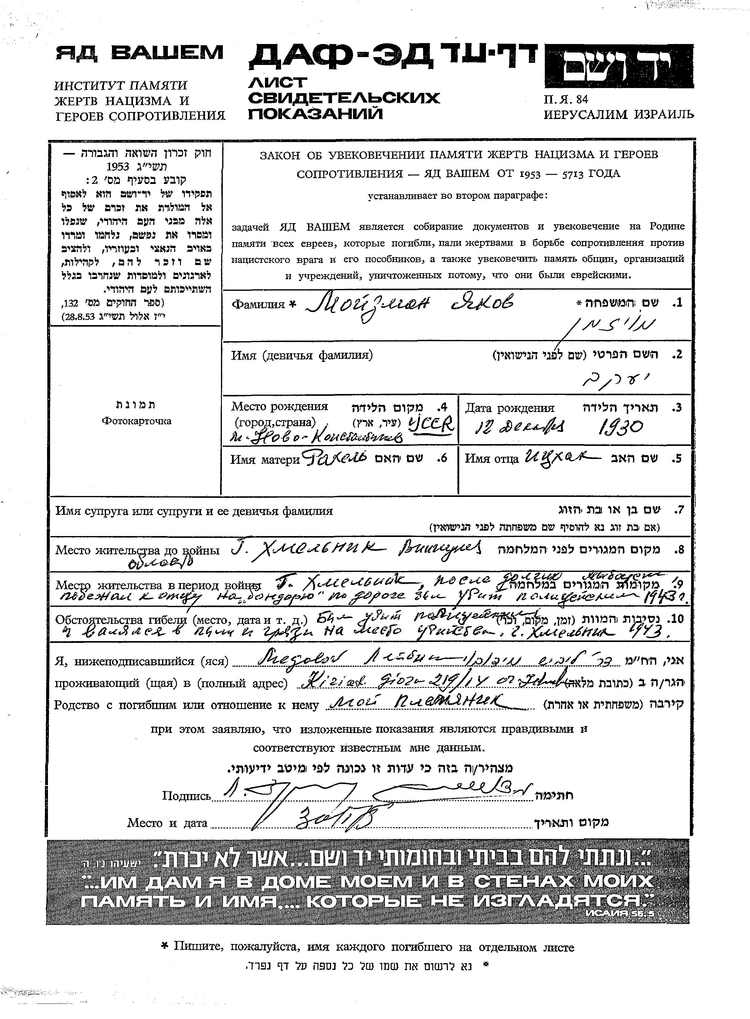 Moizman Yakov 1930 Khmelnik, Ukraine (URSS) Feuille de témoignage
