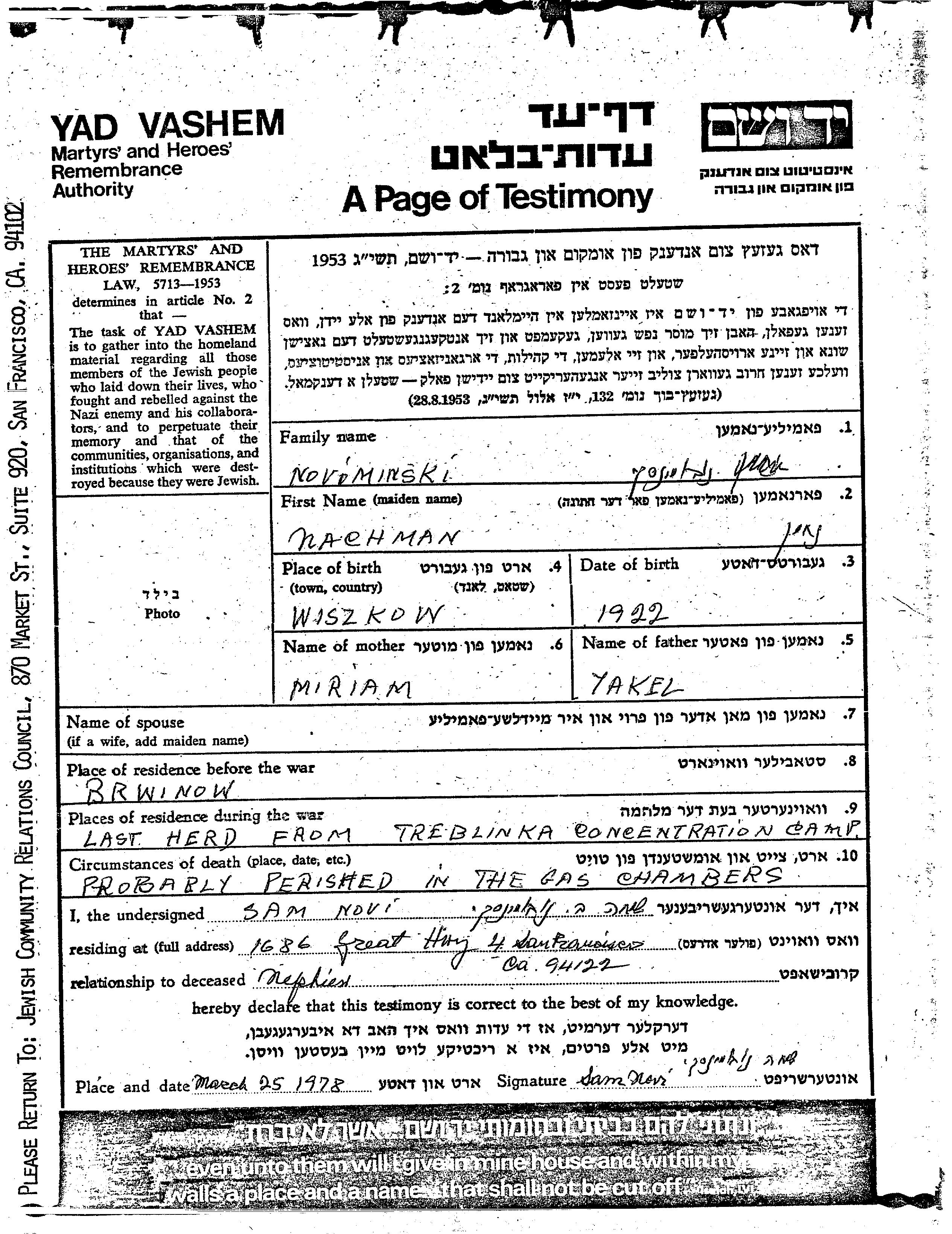 Nachman Novominski est né à Wiszkow, Pologne en 1922, fils de Yakel et de Miriam. Avant la seconde guerre mondiale il vivait à Brwinow, Pologne. Au cours de la guerre, il était à Treblinka, Pologne.