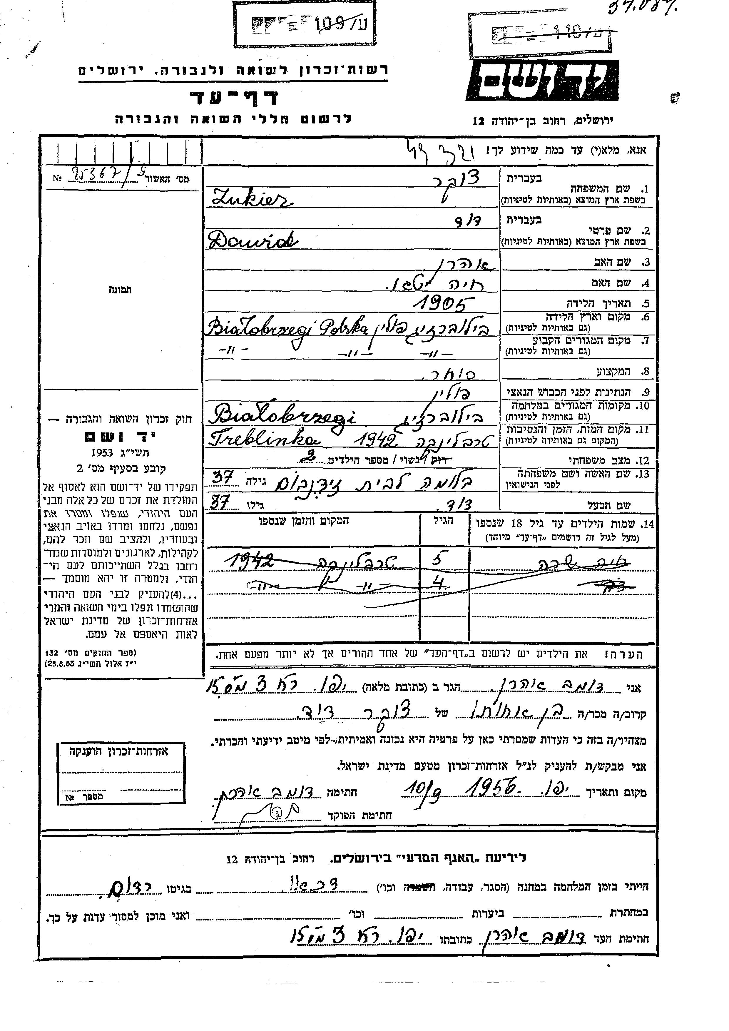 Zukier Dawid 1905 Bialobrzegi, Pologne Feuille de témoignage