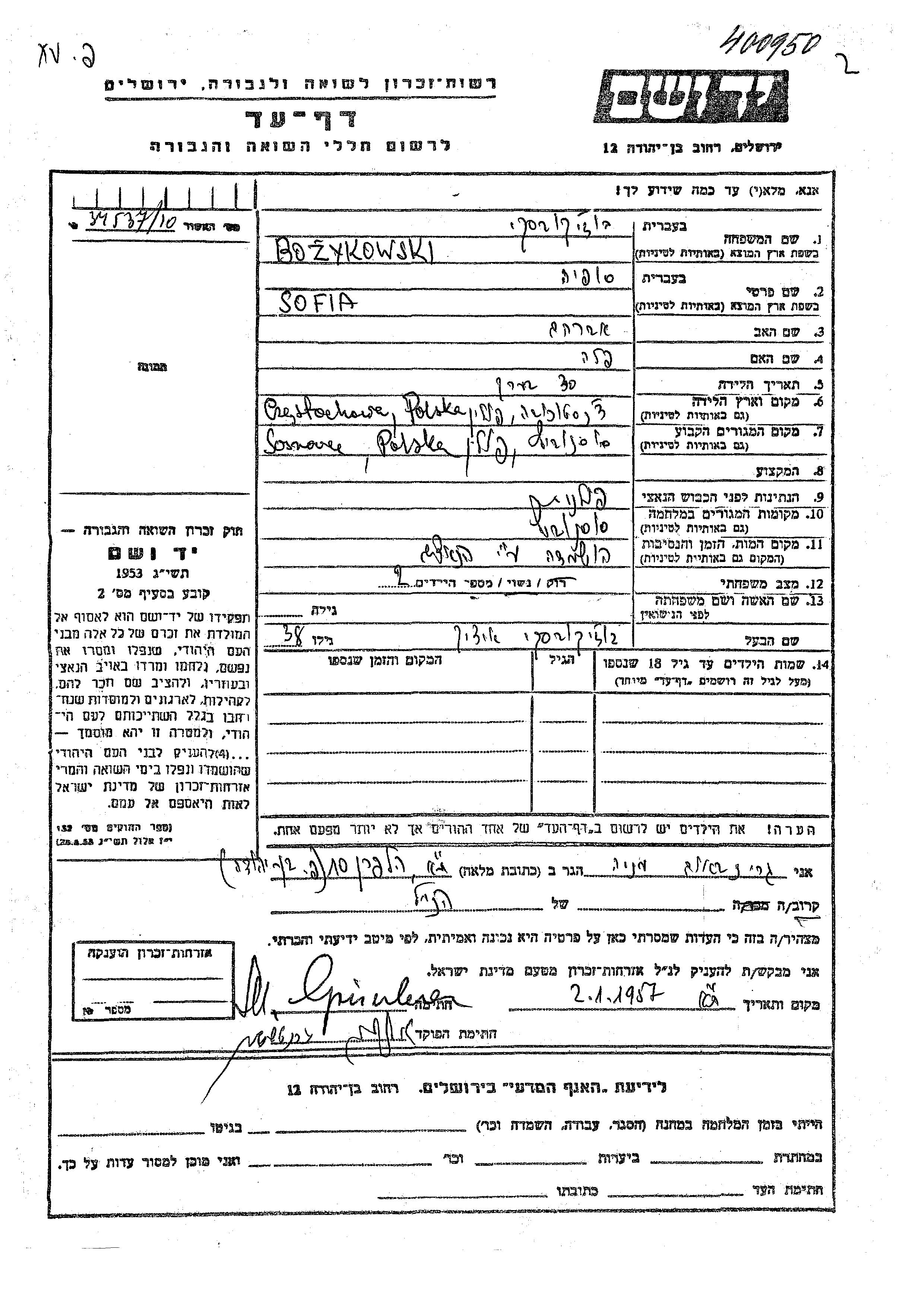 Bozykowski Sofia Sosnowiec, Pologne Feuille de témoignage