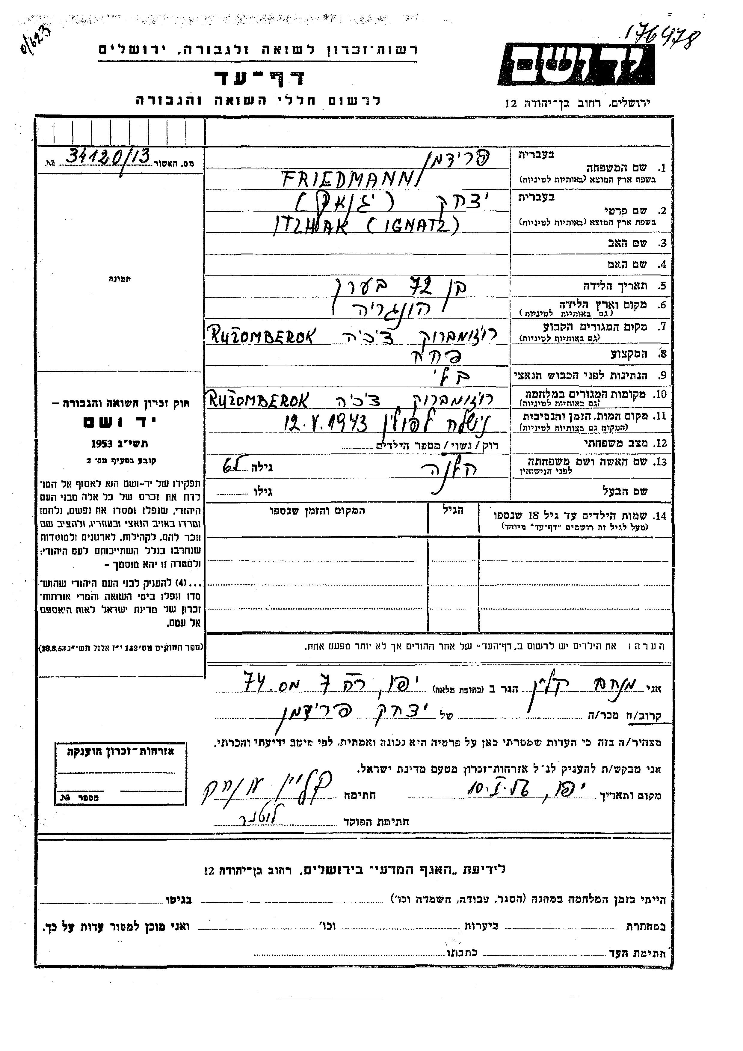 Itzhak Ignatz Friedmann est né à Hongrie. Il était Ferblantier. Avant la seconde guerre mondiale il vivait à Ruzomberok, Tchécoslovaquie. Au cours de la guerre, il était à Ruzomberok, Tchécoslovaquie.