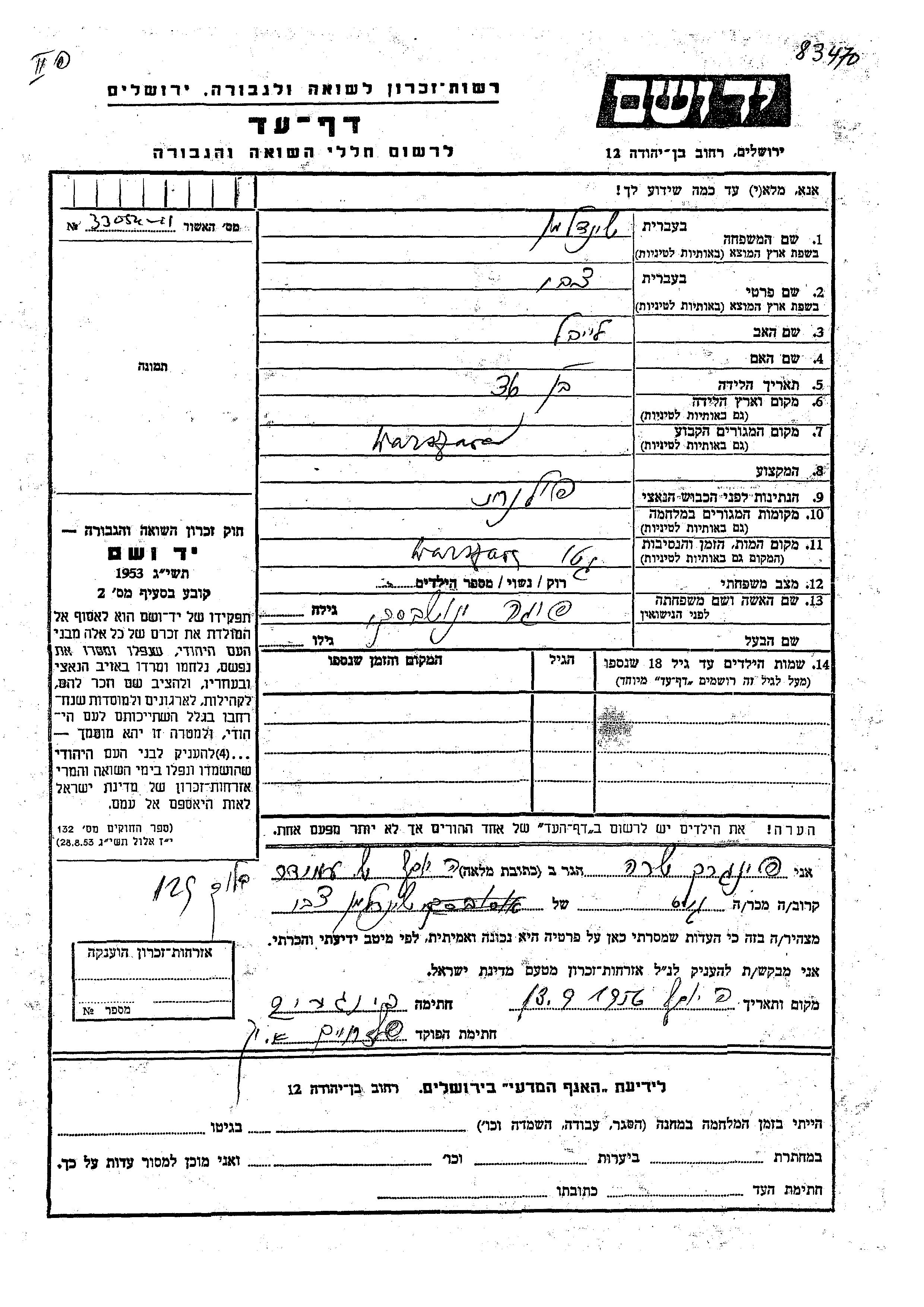 Shindelman Tzvi Warszawa, Pologne Feuille de témoignage