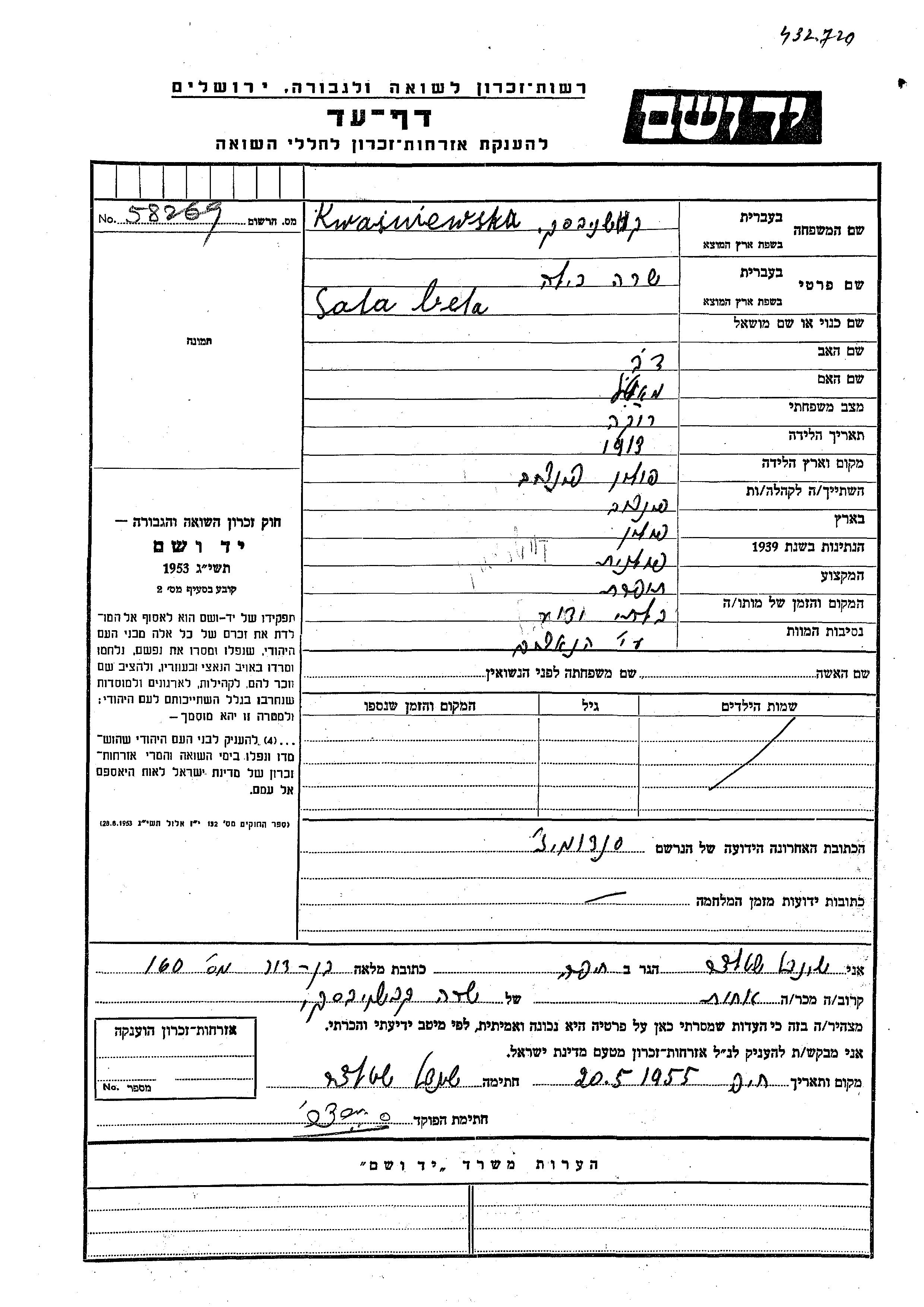 Sara Bila Kwasniewska est née à Pinczow, Pologne en 1913, fille de Dov et de Matl. Elle était Couturière et Célibataire. Avant la seconde guerre mondiale elle vivait à Pinczow, Pologne.