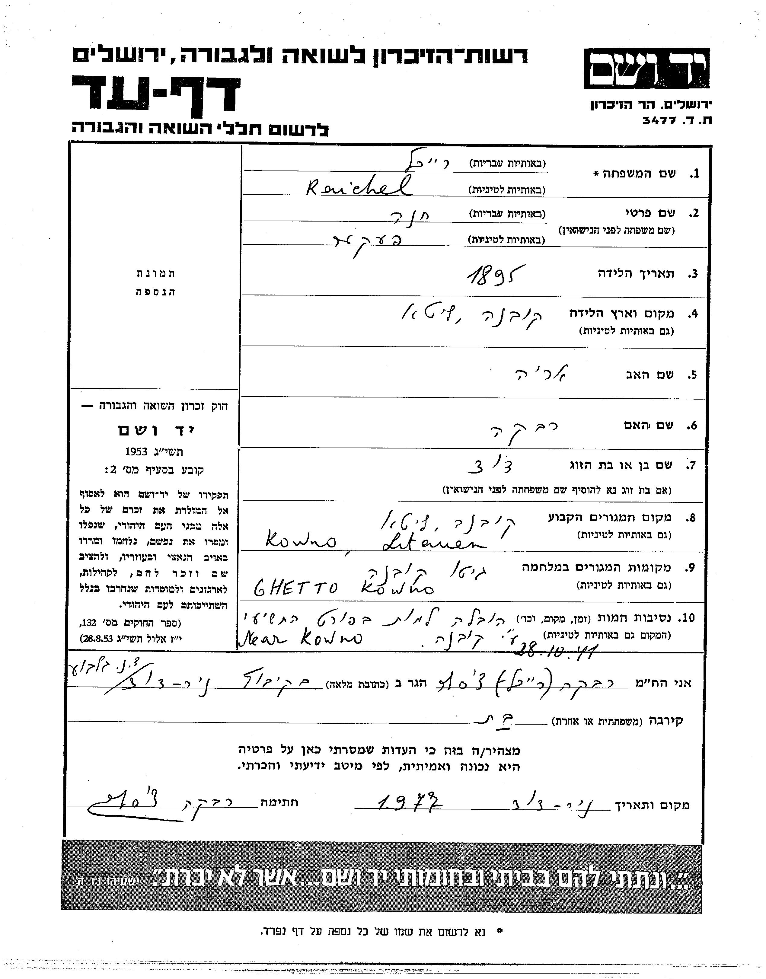 Raichel Khana 1895 Kowno, Lituanie Feuille de témoignage