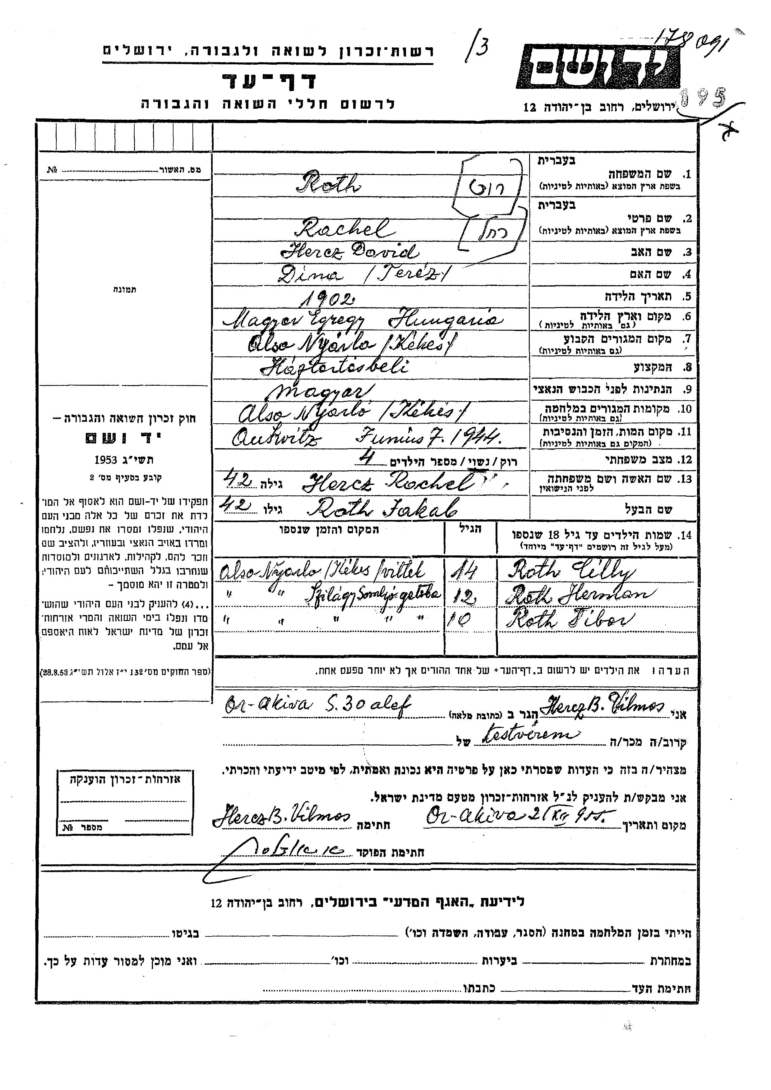Roth Rut Rachel 1902 Alsonyarlo, Roumanie Feuille de témoignage