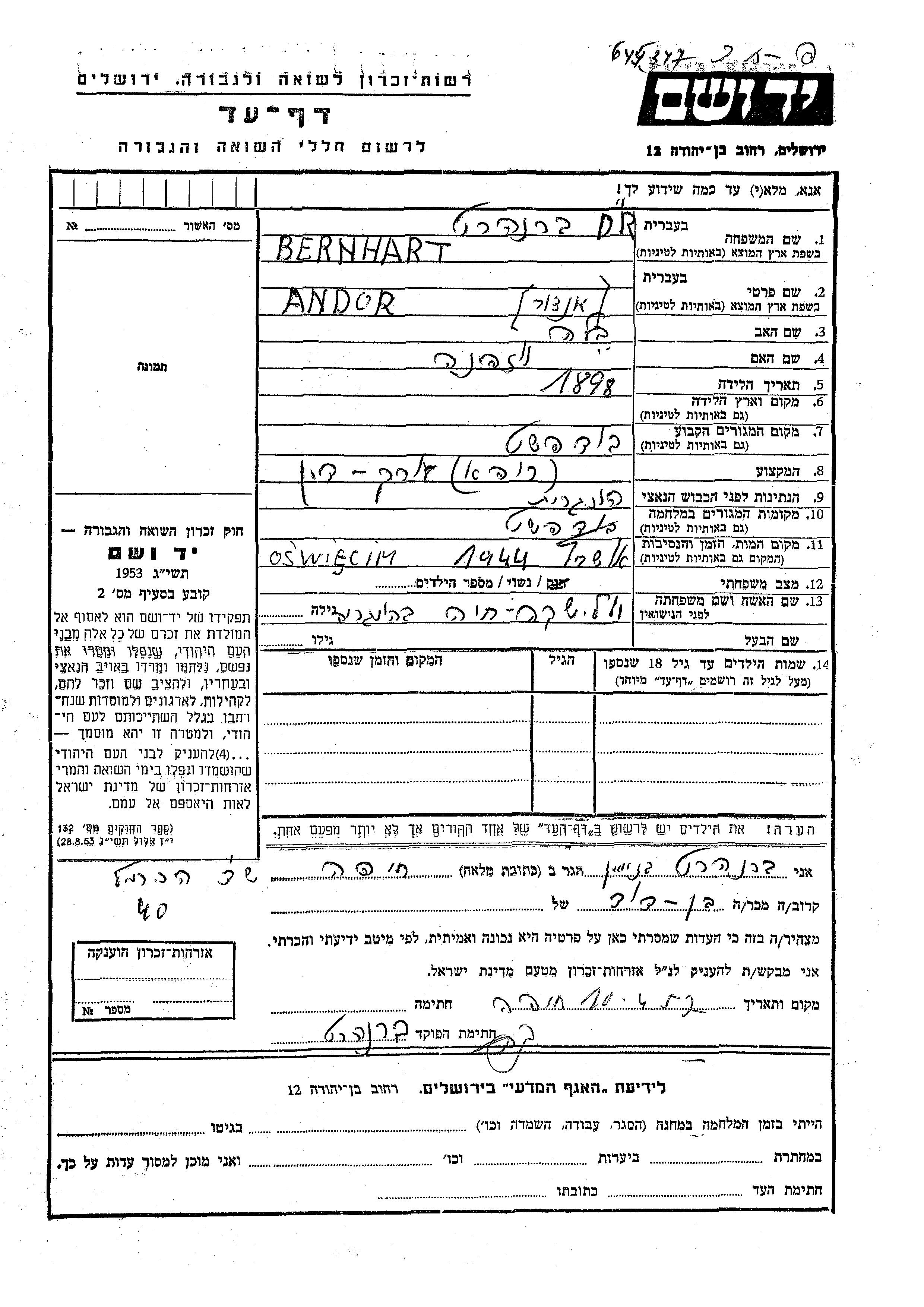 Bernhart Andor 1898 Budapest, Hongrie Feuille de témoignage