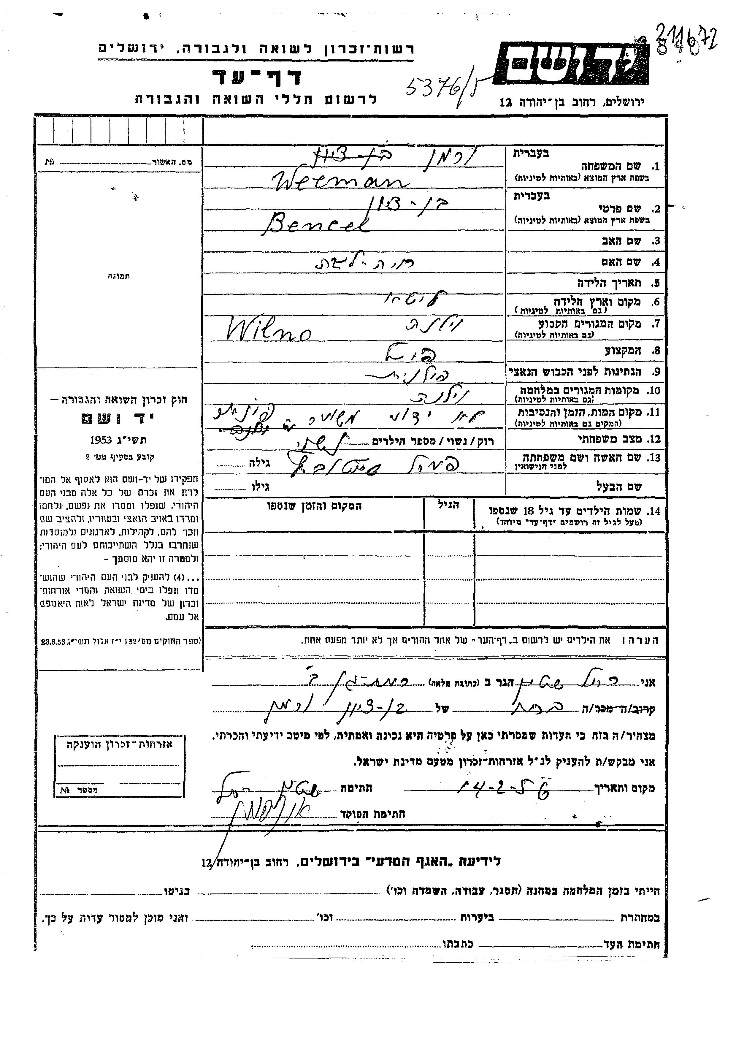 Bencel a été assassiné pendant la Shoah. Lieu de la mort: Wilna, Pologne.