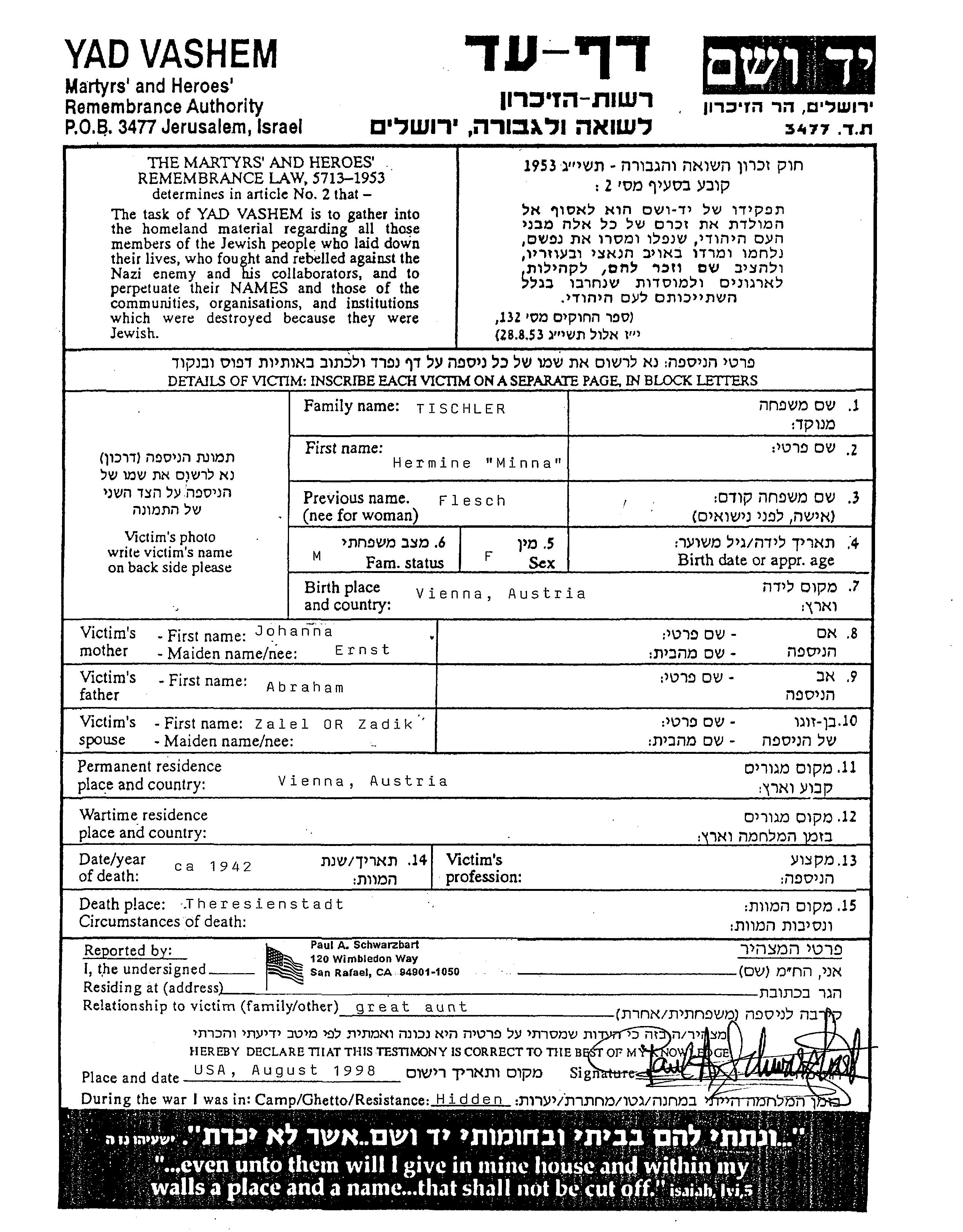 Hermine Minna Tischler née Flesch est née à Vienna, Autriche, fille de Abraham et de Johanna. Elle était Mariée à Zalel Zadik. Avant la seconde guerre mondiale elle vivait à Vienna, Autriche.