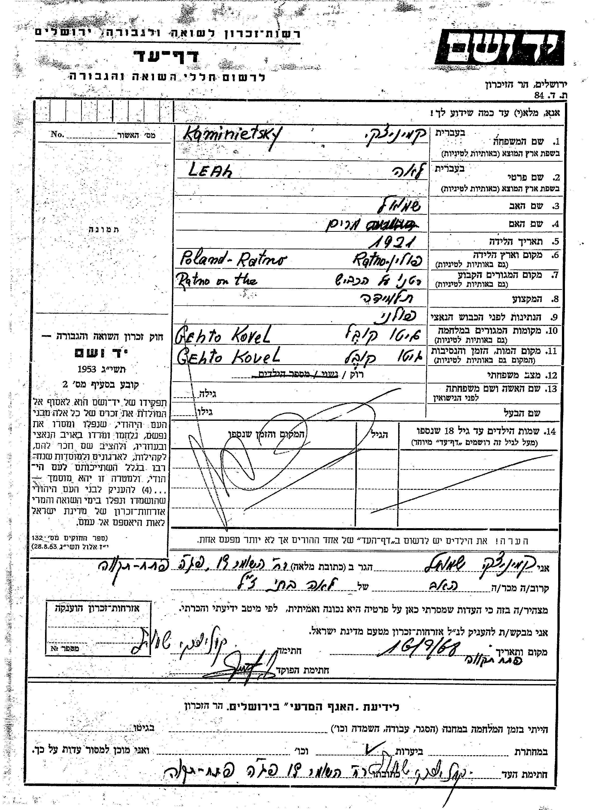 Leah Kaminietsky est née à Ratno, Pologne en 1921, fille de Shmuel et de Miriam. Elle était Élève et Célibataire. Avant la seconde guerre mondiale elle vivait à Ratno, Pologne. Pendant la guerre, elle était à Kovel, Pologne.