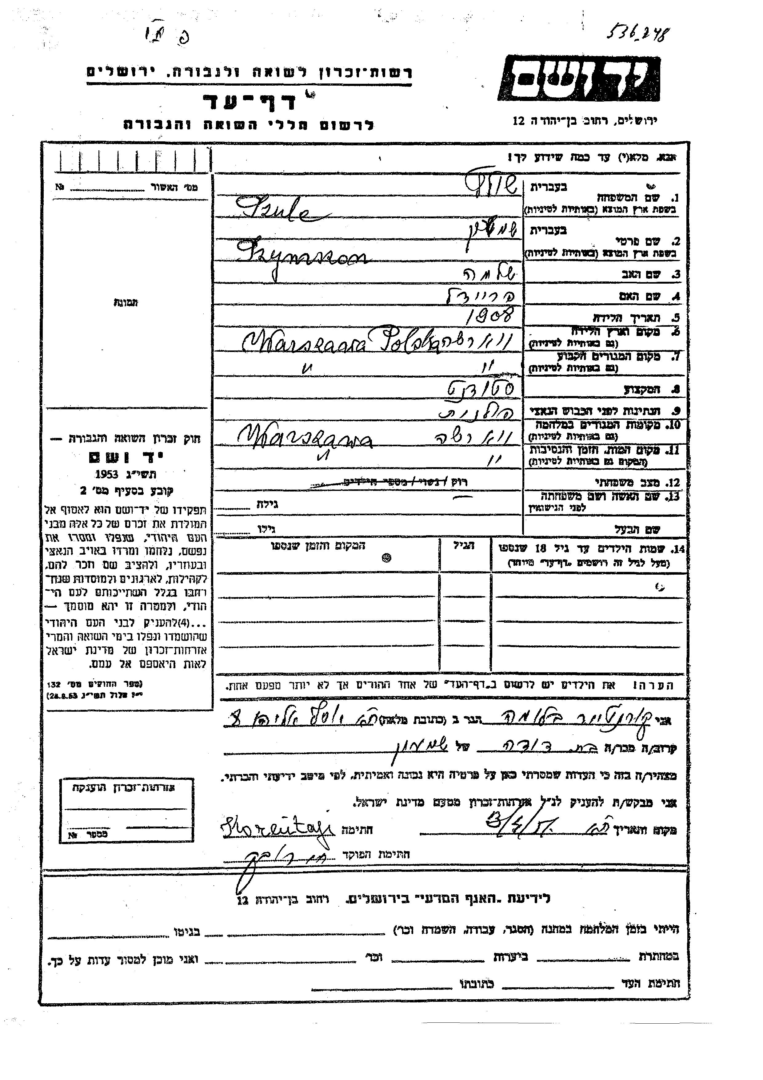 Szulc Szymszon Shimon 1908 Warszawa, Pologne Feuille de témoignage