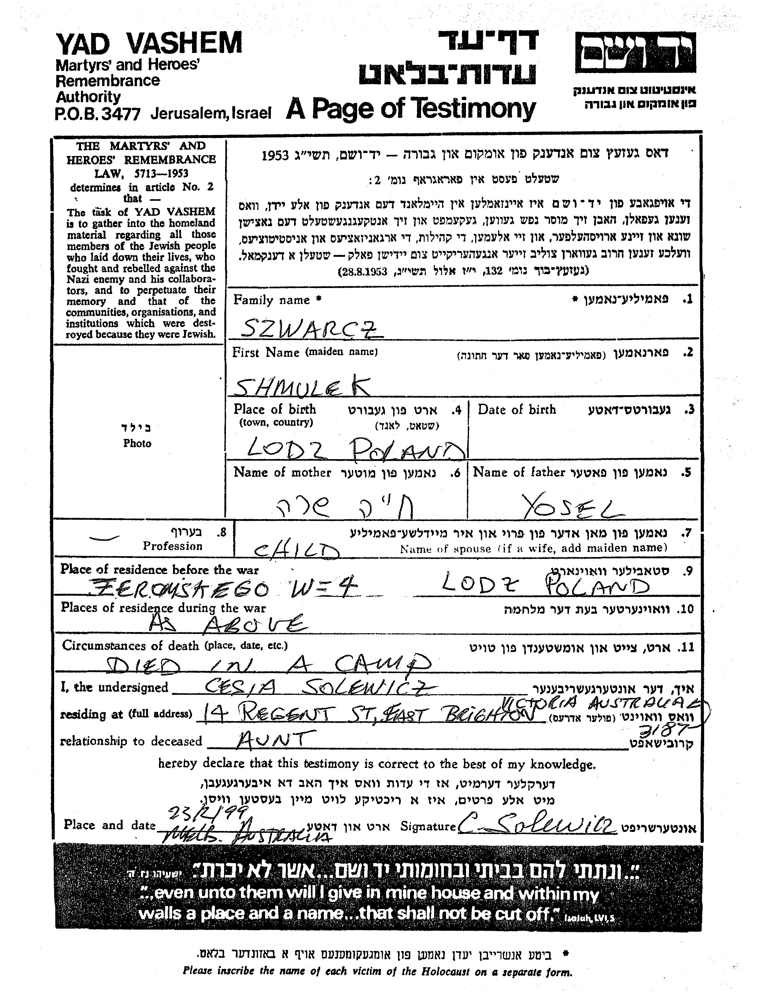 Szwarcz Shmulek Lodz, Pologne Feuille de témoignage