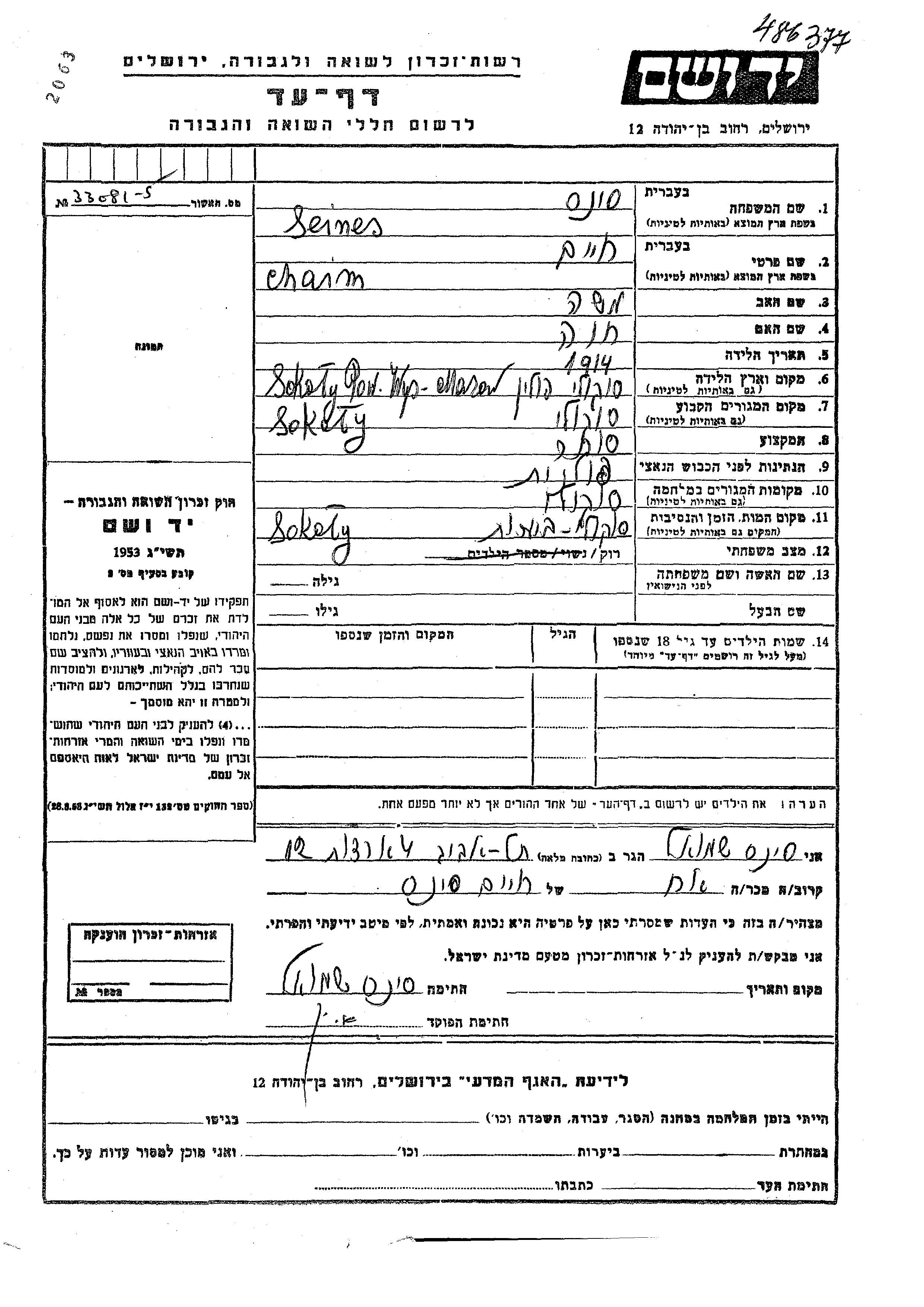 Chaim Seines est né à Sokoly, Pologne en 1914, fils de Moshe et de Khava. Il était Commerçant/e et Célibataire. Avant la seconde guerre mondiale il vivait à Sokoly, Pologne. Au cours de la guerre, il était à Sokoly, Pologne.