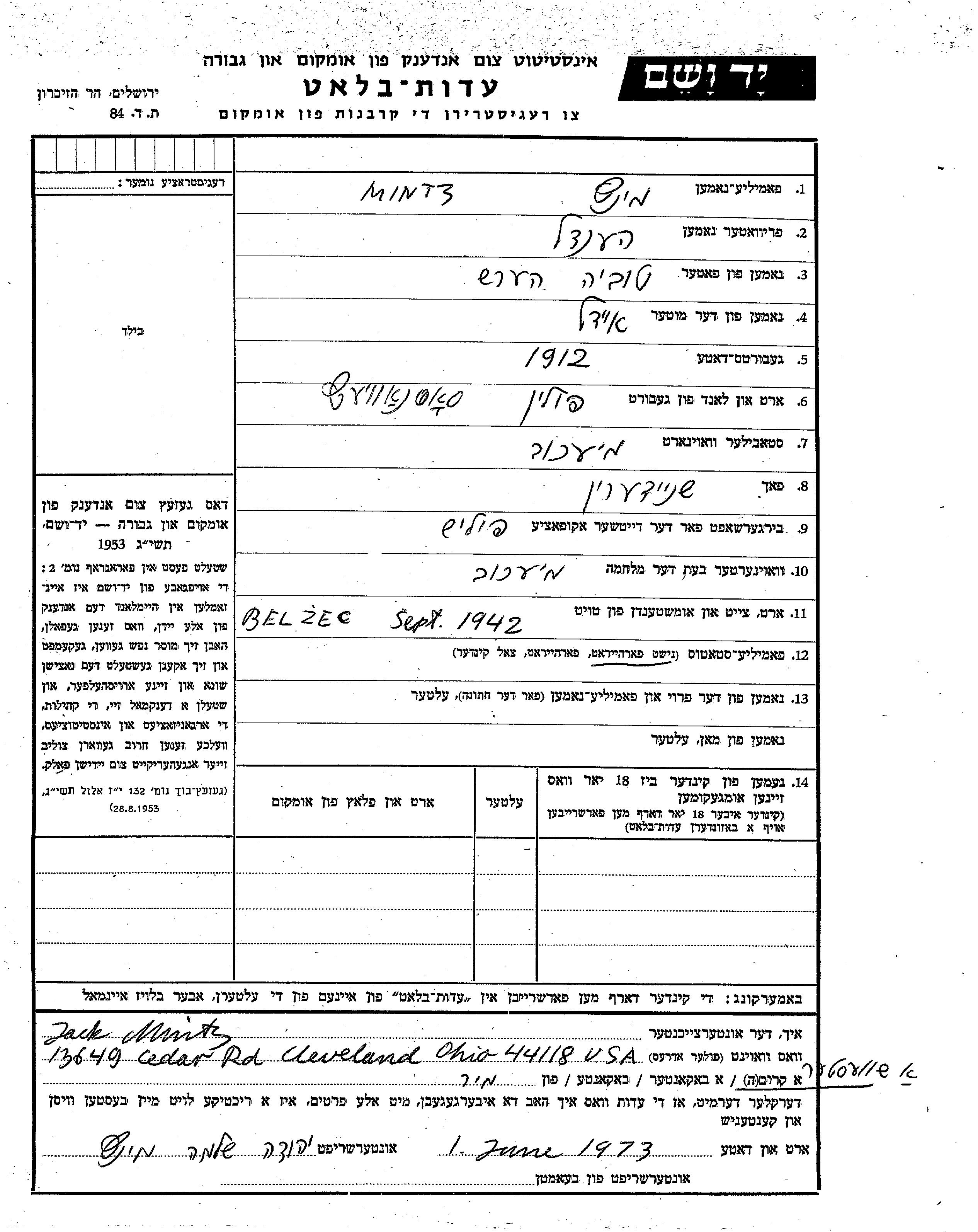 Mintz Hendel 1912 Miechow, Pologne Feuille de témoignage