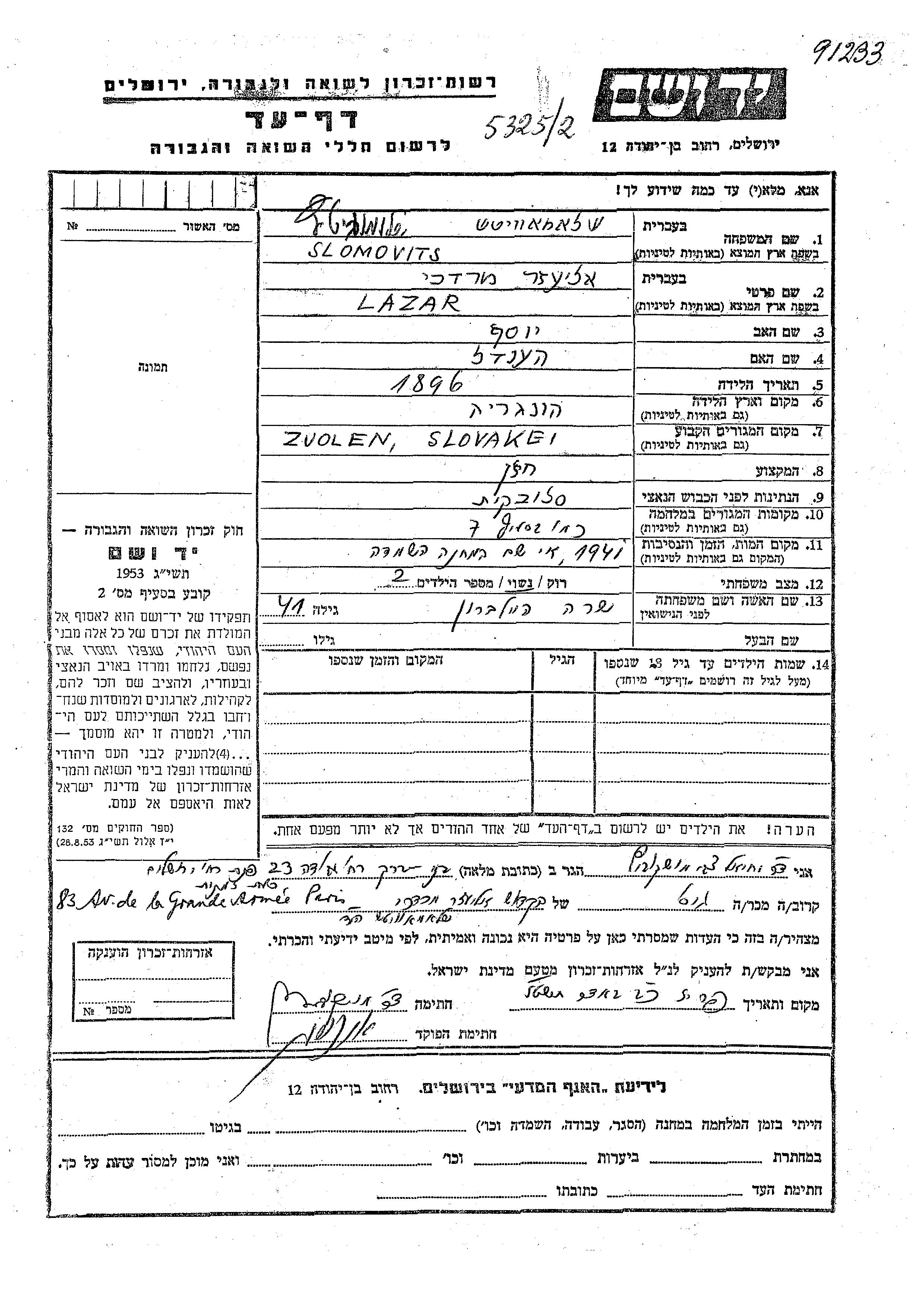 Slomovits Lazar Mordekhai 1896 Zvolen, Tchécoslovaquie Feuille de témoignage