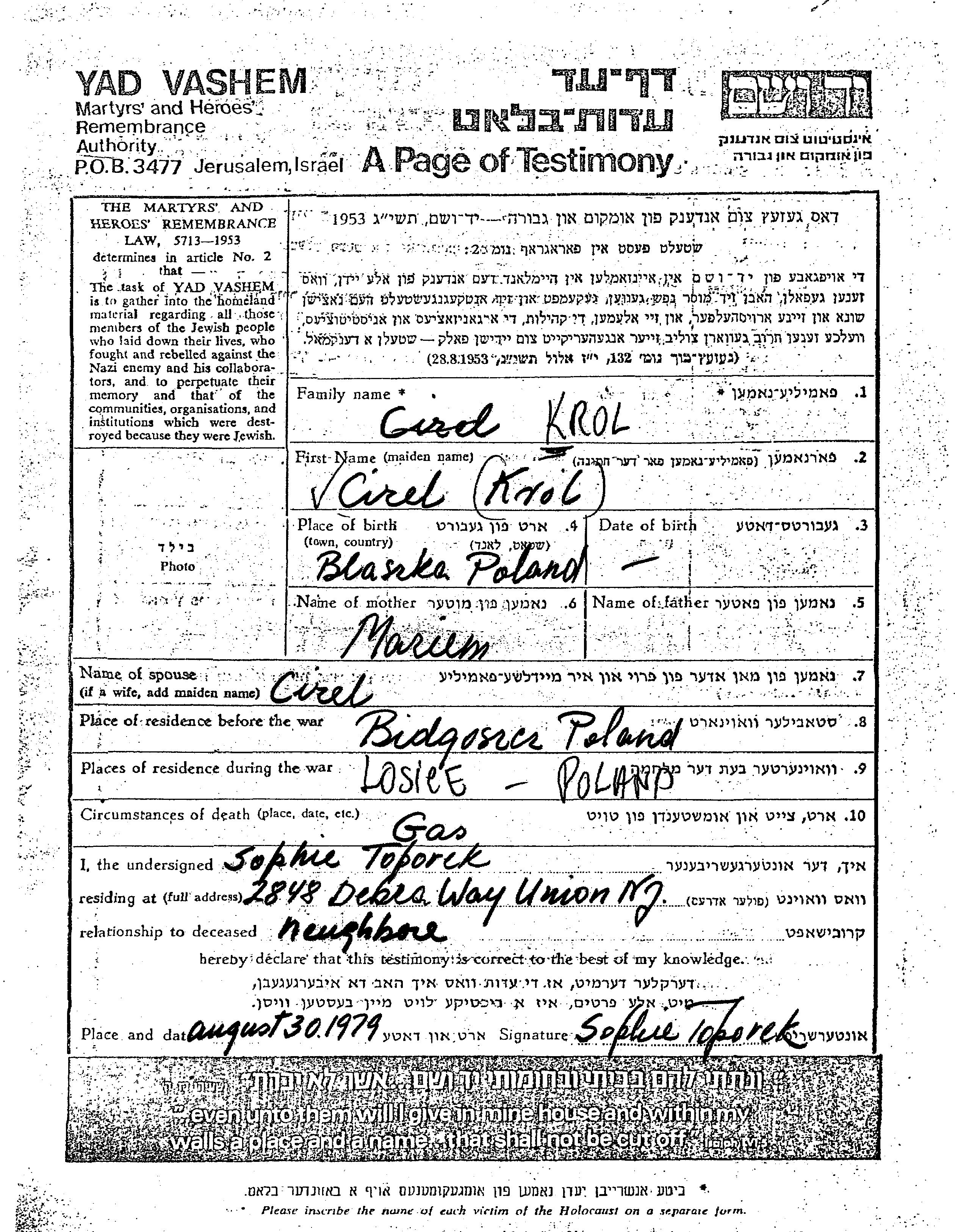Cirel Krol est née à Blaszka, Pologne, fille de Marien. Avant la seconde guerre mondiale elle vivait à Bidgoshch, Pologne. Pendant la guerre, elle était à Losice, Pologne.