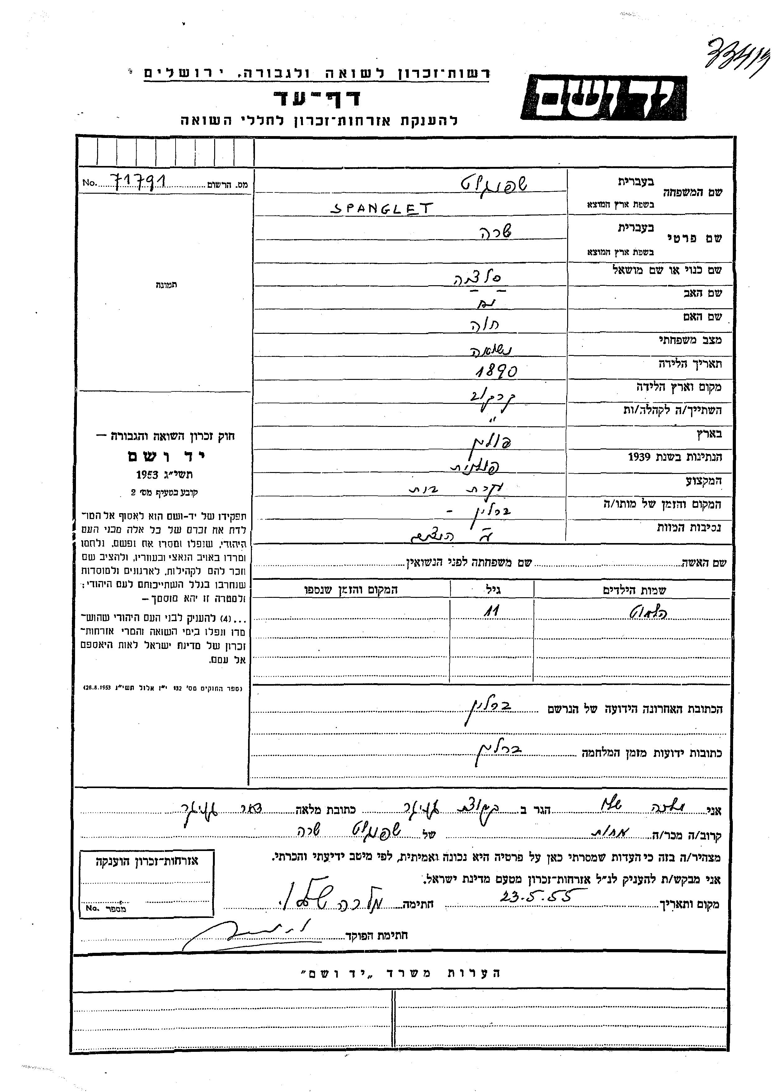Spanglet Sara Shulamit 1890 Krakow, Pologne Feuille de témoignage