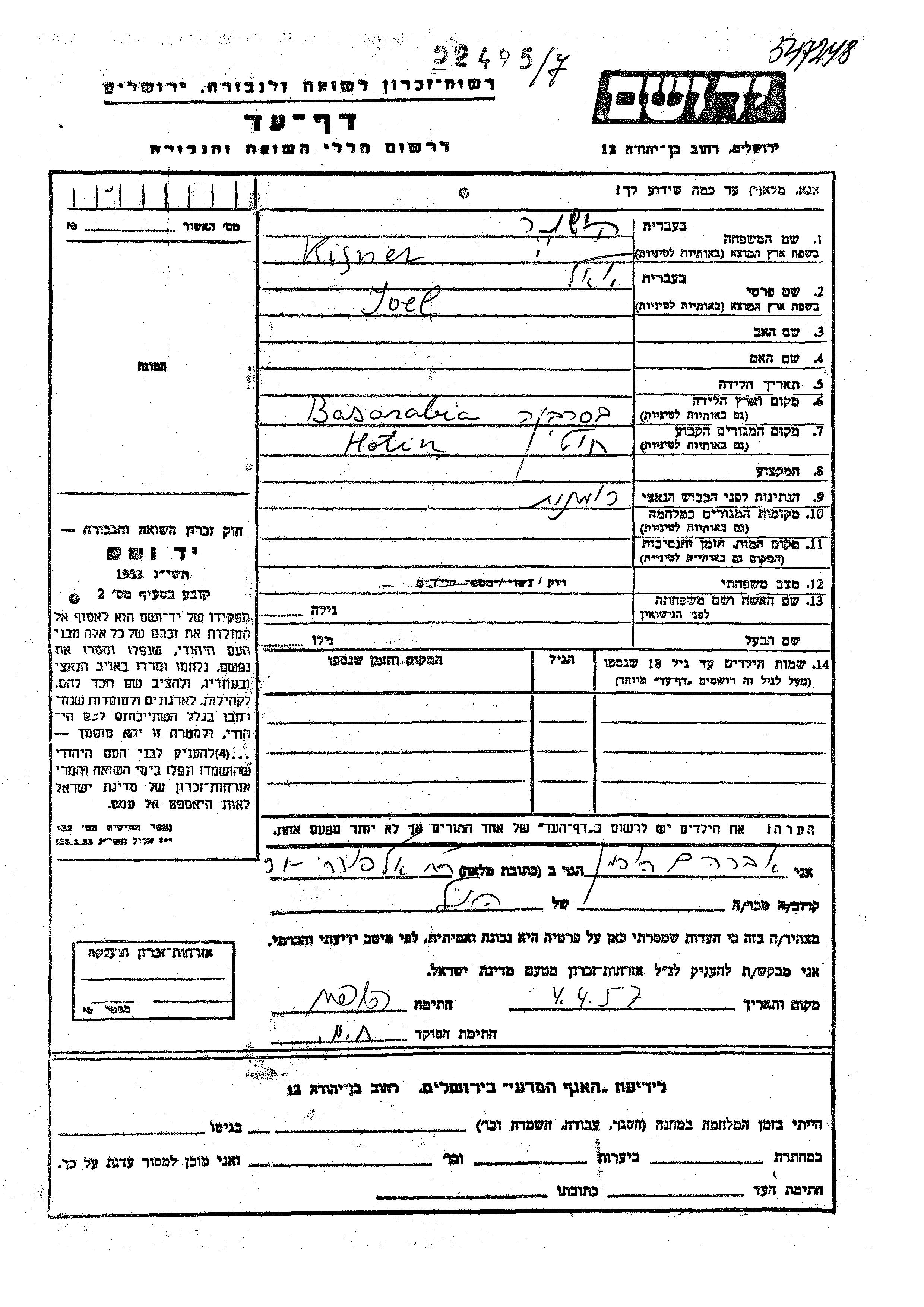 Joel Kishner Kisner est né à Bessarabia, Roumanie. Il était Célibataire. Avant la seconde guerre mondiale il vivait à Hotin, Roumanie.