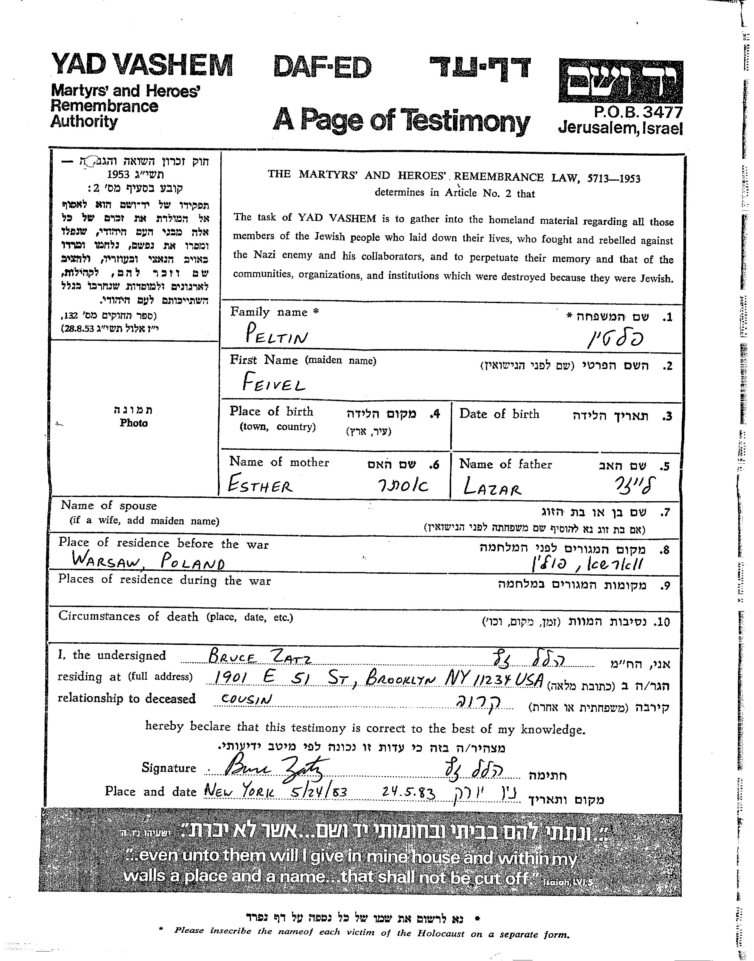 Faivel Peltin est né fils de Lazar et de Esther. Avant la seconde guerre mondiale il vivait à Warsaw, Pologne.