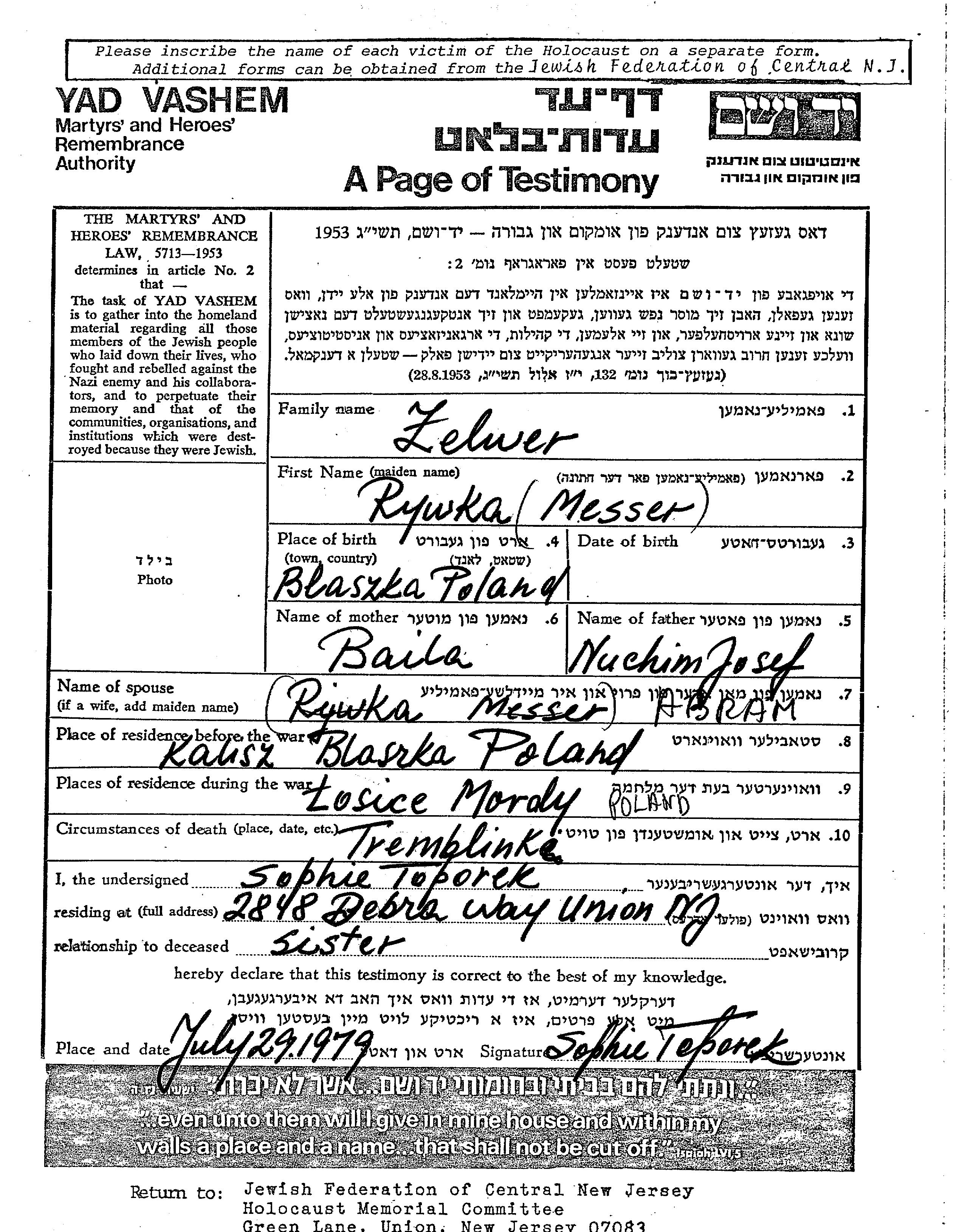 Zelwer Rywka Blaszka, Pologne Feuille de témoignage