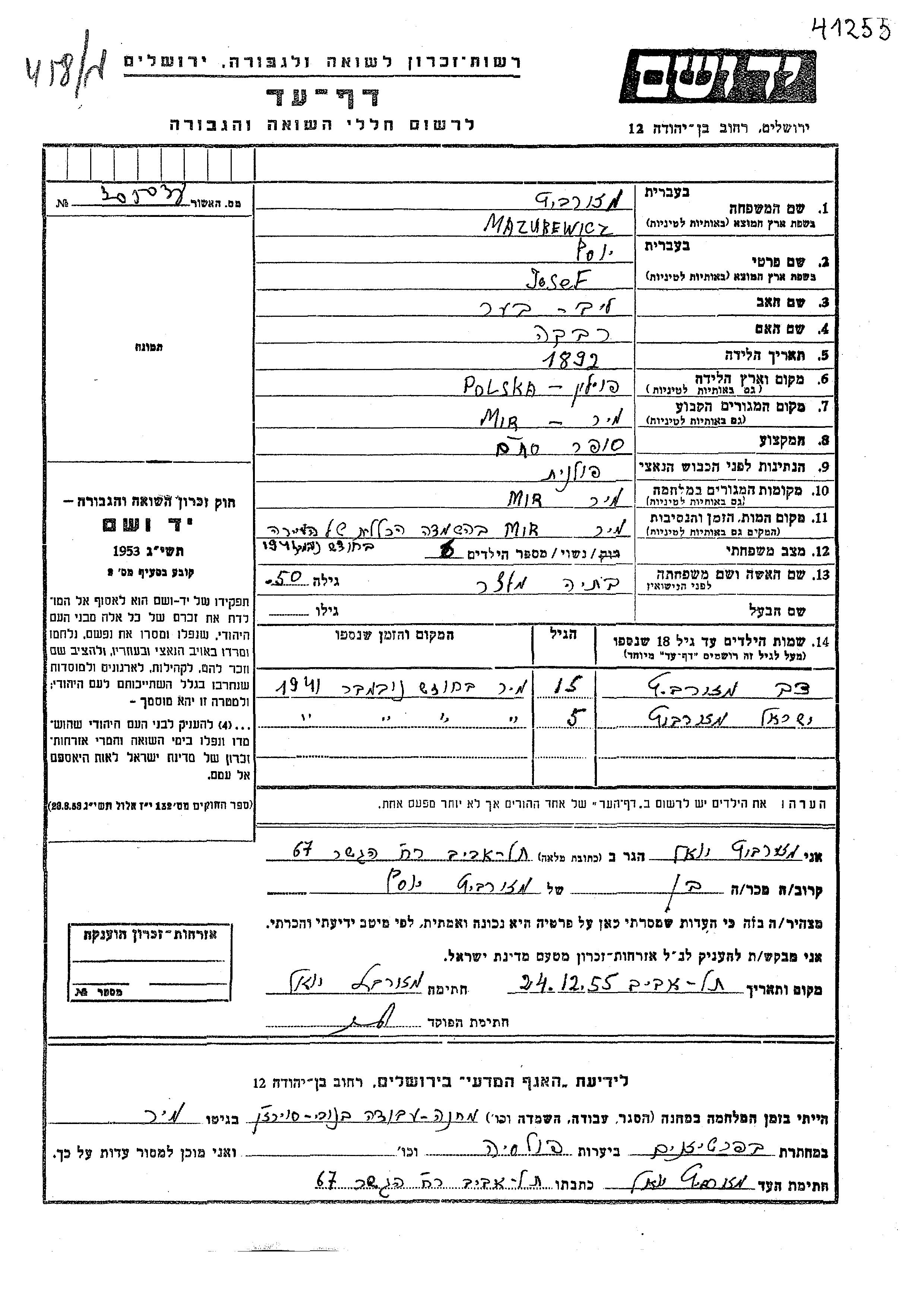 Josef Mazurewicz est né à Pologne en 1892, fils de Leib Ber et de Rivka. Il était Scribe de sefer torah et Mariée à Batia née Meltzer. Avant la seconde guerre mondiale il vivait à Mir, Pologne. Au cours de la guerre, il était à Mir, Pologne.
