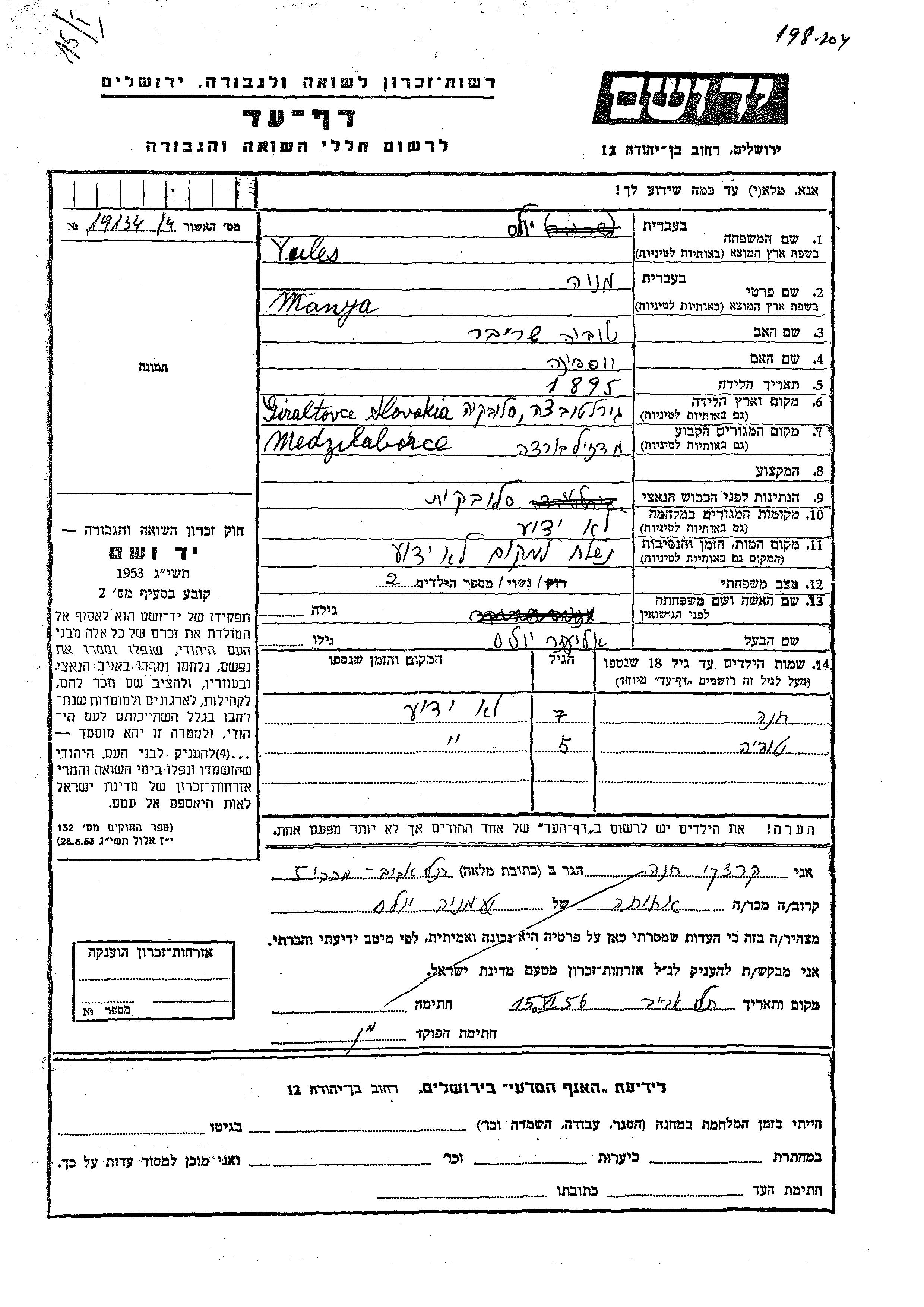 Manya Yules née Shreiber est née à Giraltovce, Tchécoslovaquie en 1895, fille de Tuvia et de Iosefina. Elle était Mariée à Eliezer. Avant la seconde guerre mondiale elle vivait à Medzilaborce, Tchécoslovaquie.
