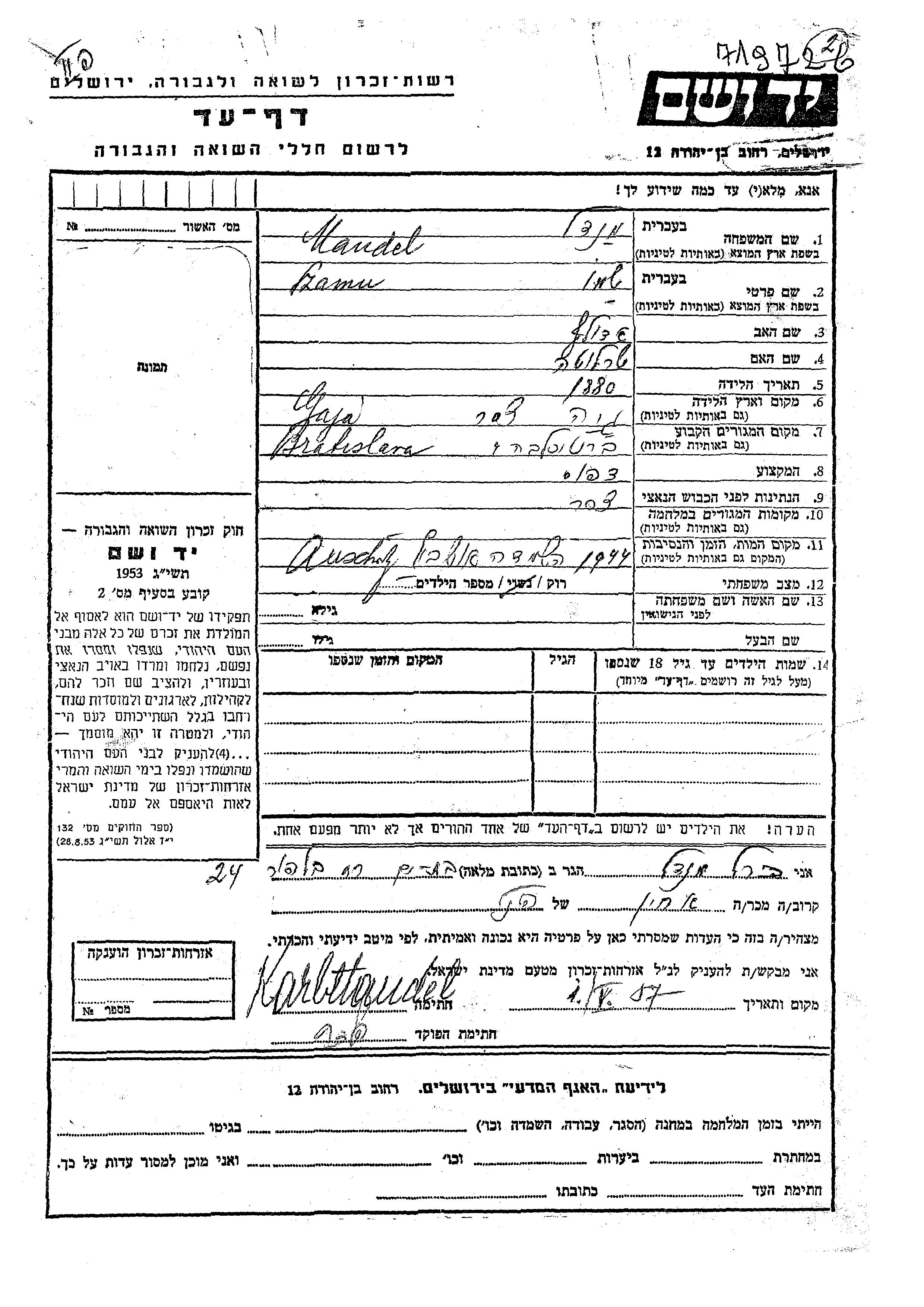 Mandel Szamu Shamu 1880 Bratislava, Tchécoslovaquie Feuille de témoignage
