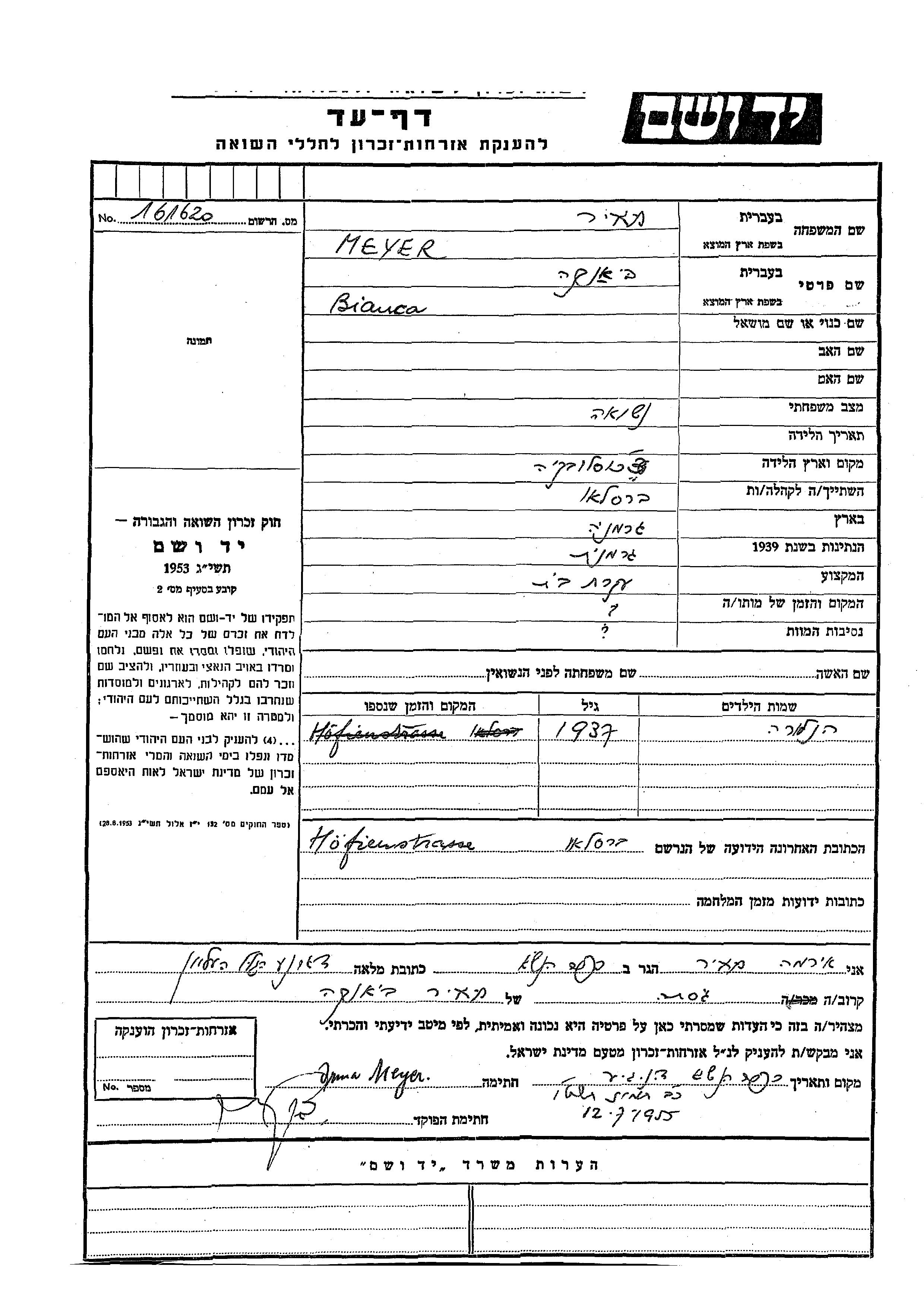 Meyer Bianca Breslau, Allemagne Feuille de témoignage
