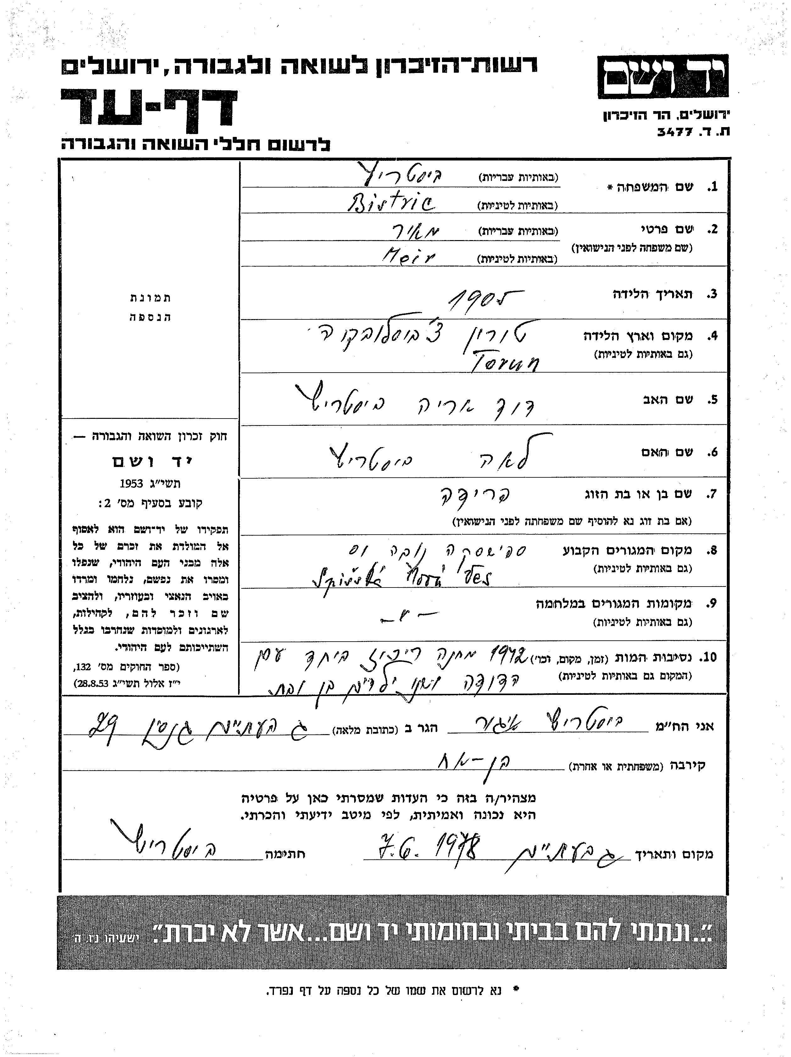 Meir Bistric est né à Torun, Tchécoslovaquie en 1905, fils de David Arie et de Lea. Il était Mariée à Frida. Avant la seconde guerre mondiale il vivait à Spisska Nova Ves, Tchécoslovaquie. Au cours de la guerre, il était à Spisska Nova Ves, Tchécoslovaquie.