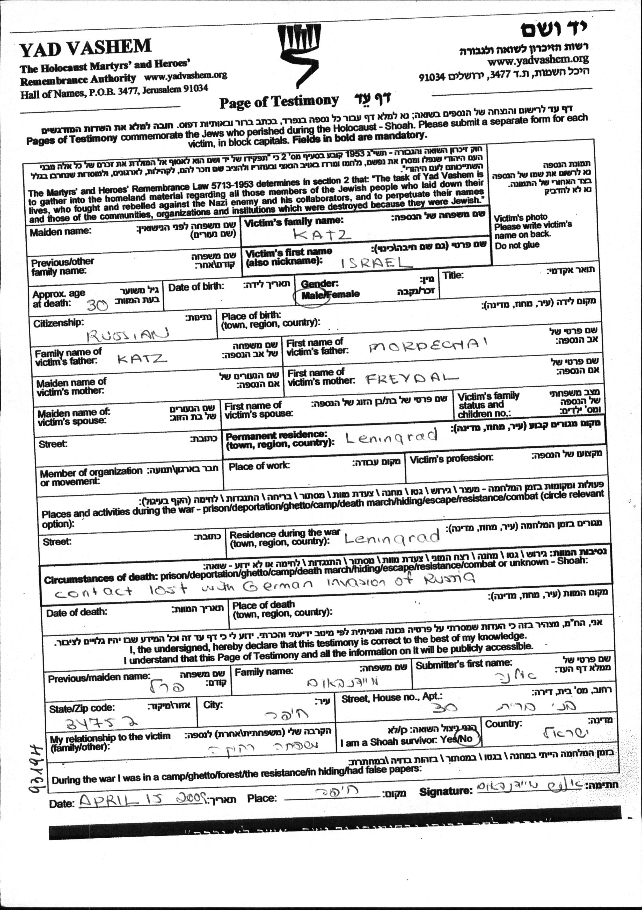 Israel Katz est né fils de Mordechai et de Freydal. Avant la seconde guerre mondiale il vivait à Leningrad, Russie (URSS). Au cours de la guerre, il était à Leningrad, Russie (URSS).
