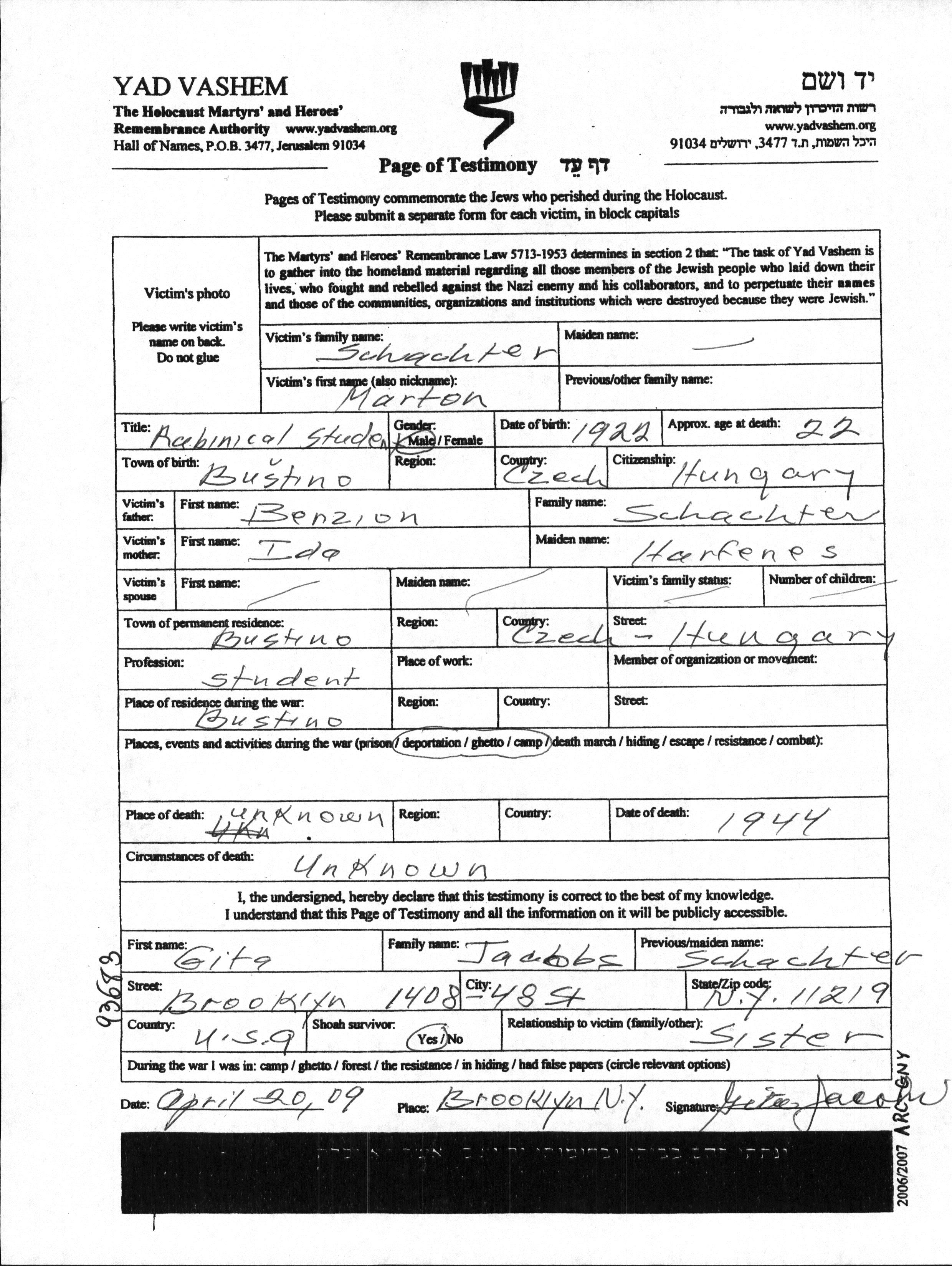 Marton Schachter est né à Bustina, Tchécoslovaquie en 1922, fils de Benzion et de Ida née Harfenes. Il était Étudiant/e et Célibataire. Avant la seconde guerre mondiale il vivait à Bustina, Tchécoslovaquie.