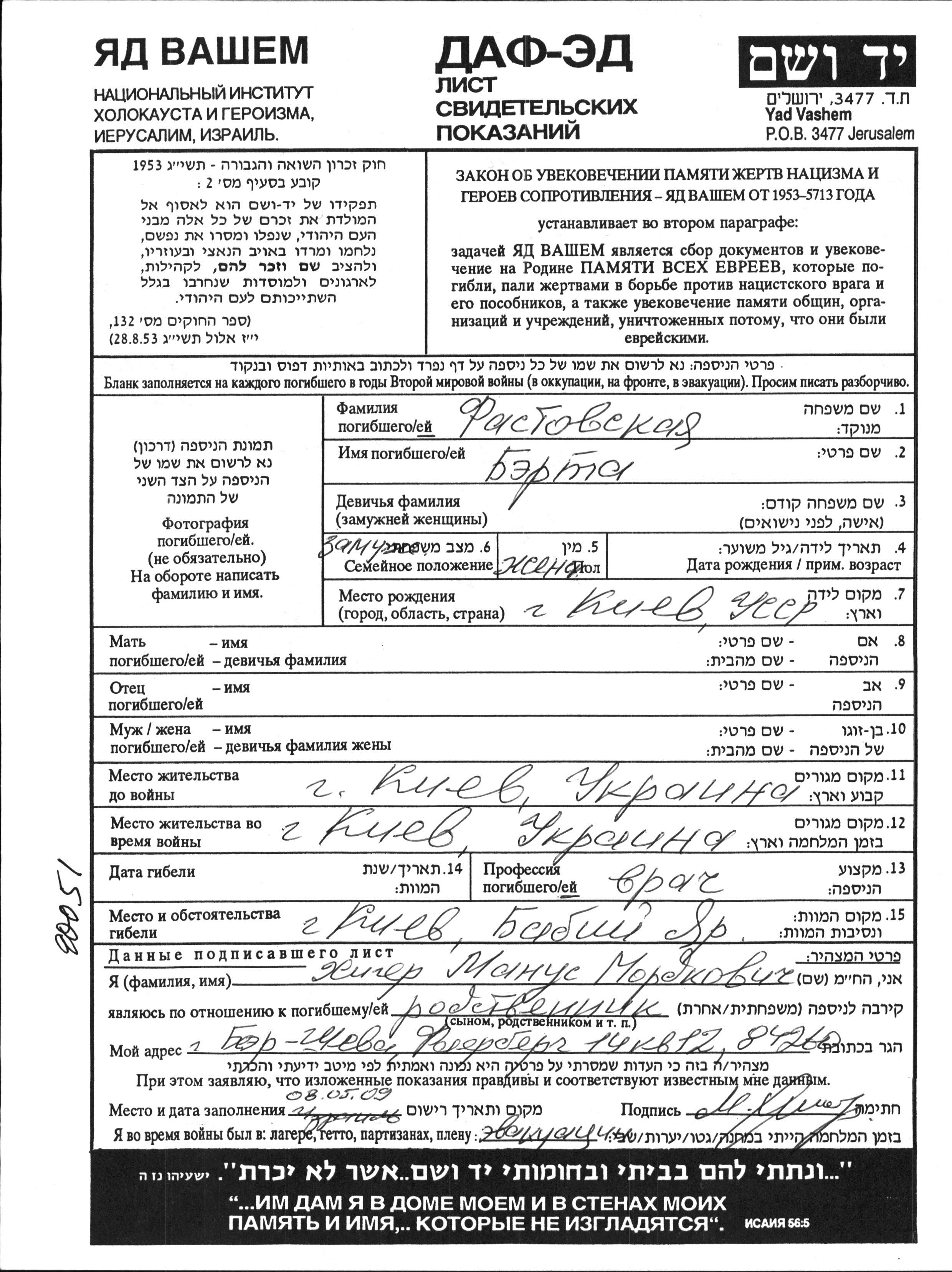 Fastovskaya Berta Kiev, Ukraine (URSS) Feuille de témoignage