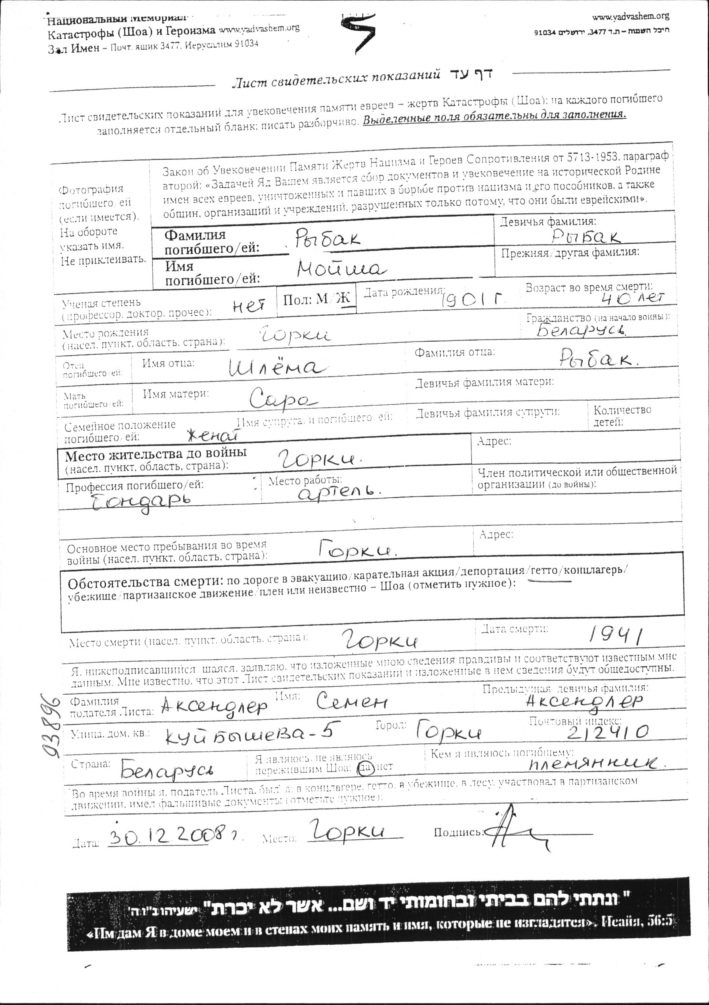 Rybak Moisha 1901 Gorki, Bélorussie (URSS) Feuille de témoignage