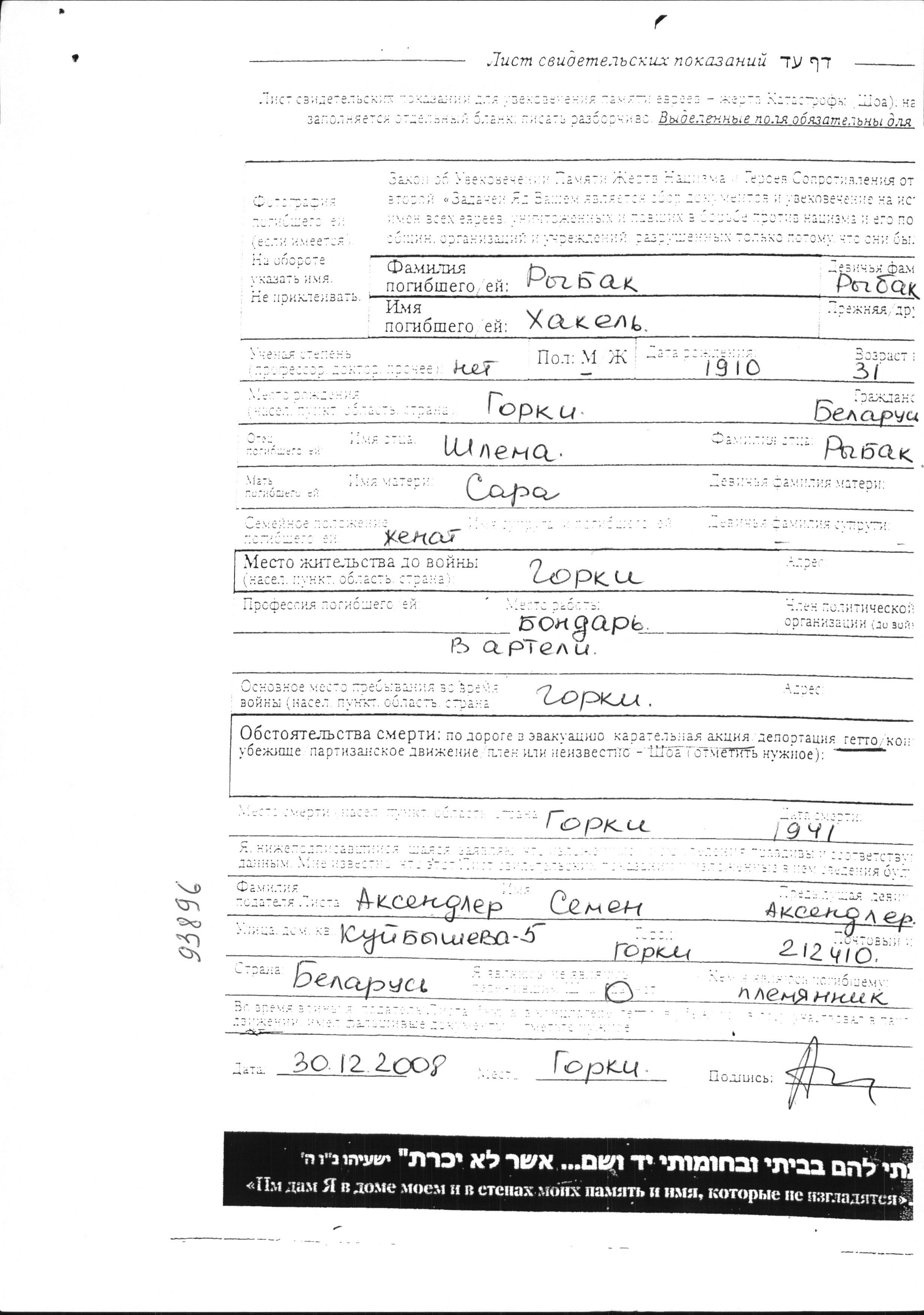Rybak Khakel 1910 Gorki, Bélorussie (URSS) Feuille de témoignage