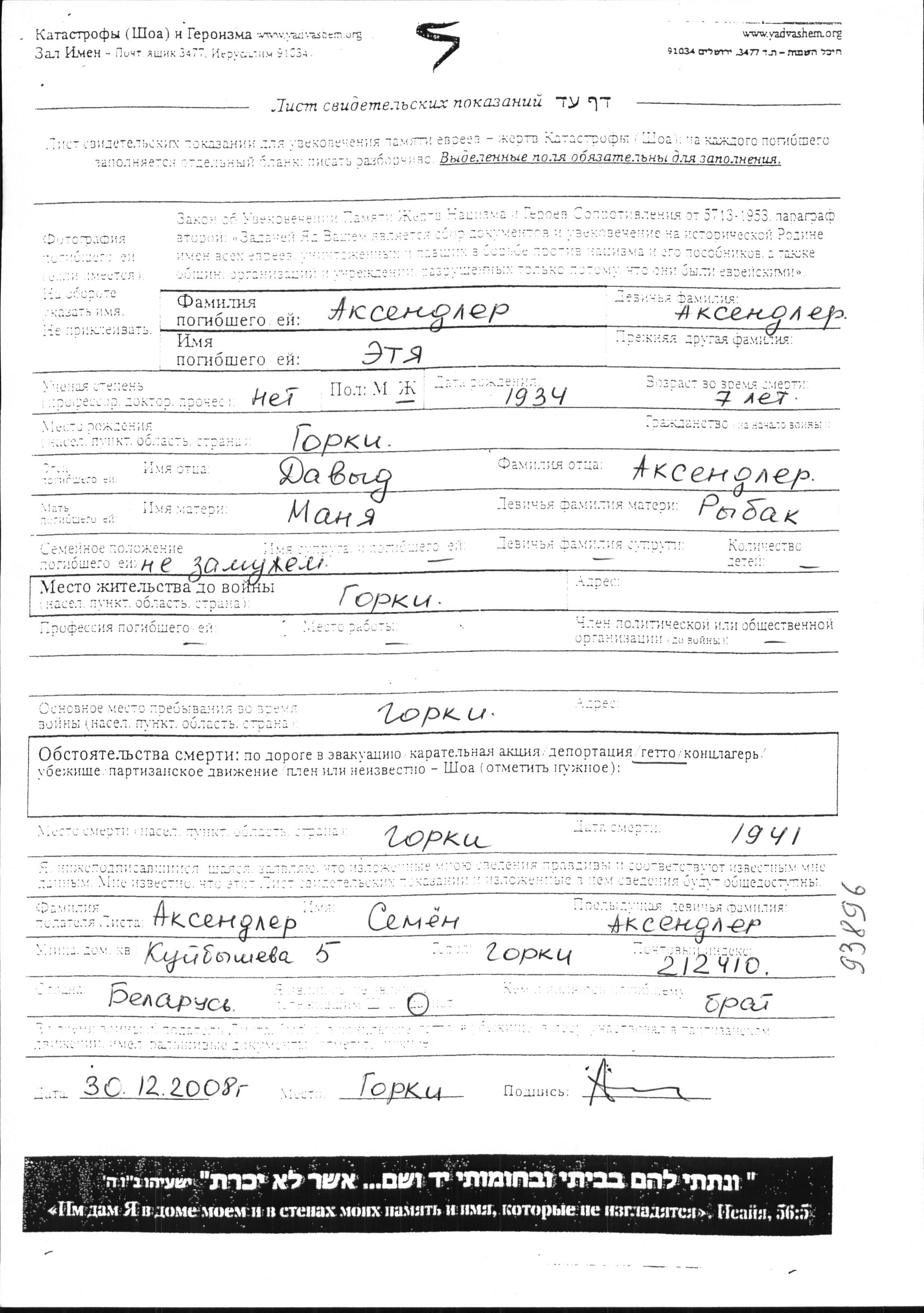 Aksendler Etya 1934 Gorki, Bélorussie (URSS) Feuille de témoignage