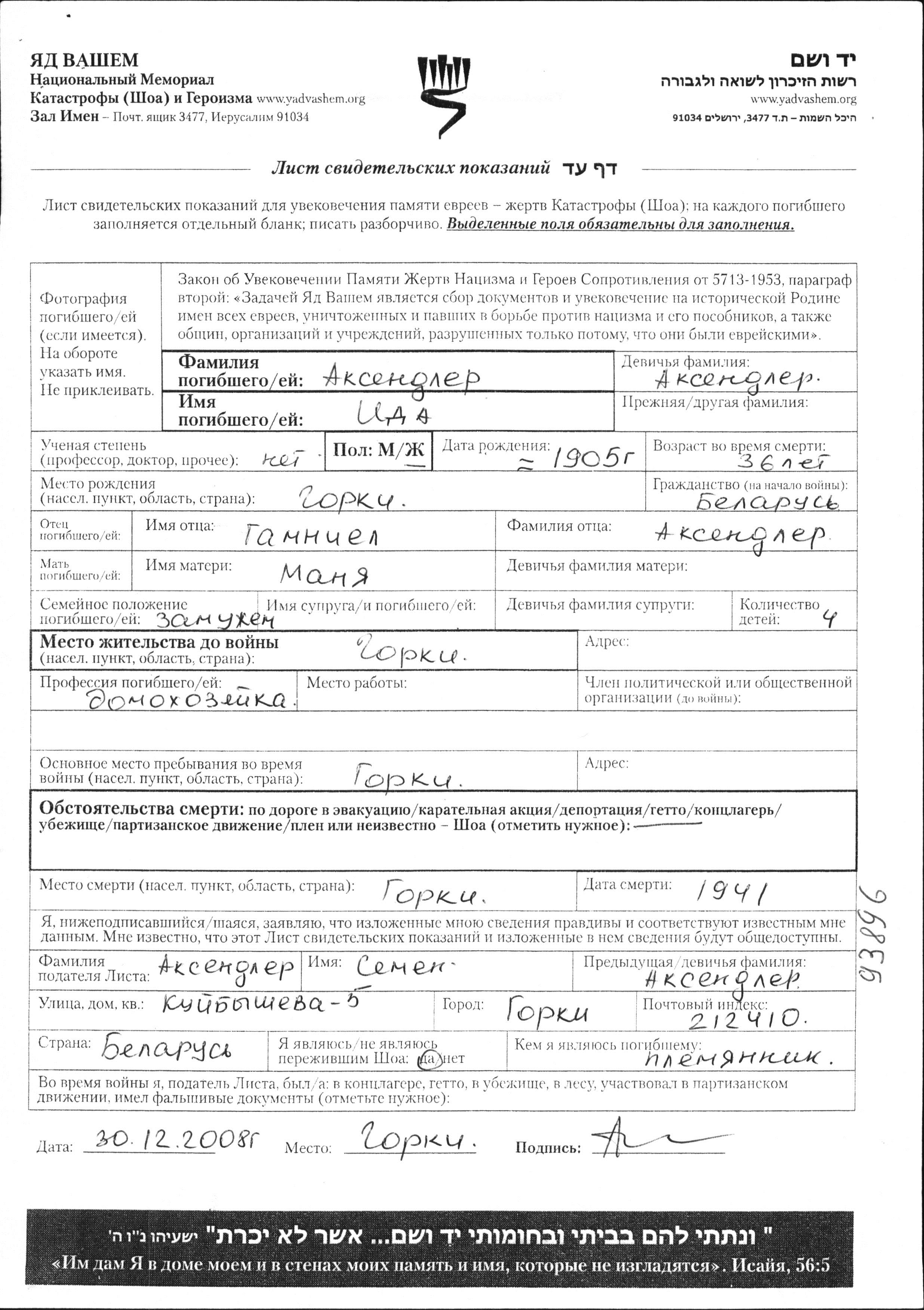 Aksendler Ida 1905 Gorki, Bélorussie (URSS) Feuille de témoignage