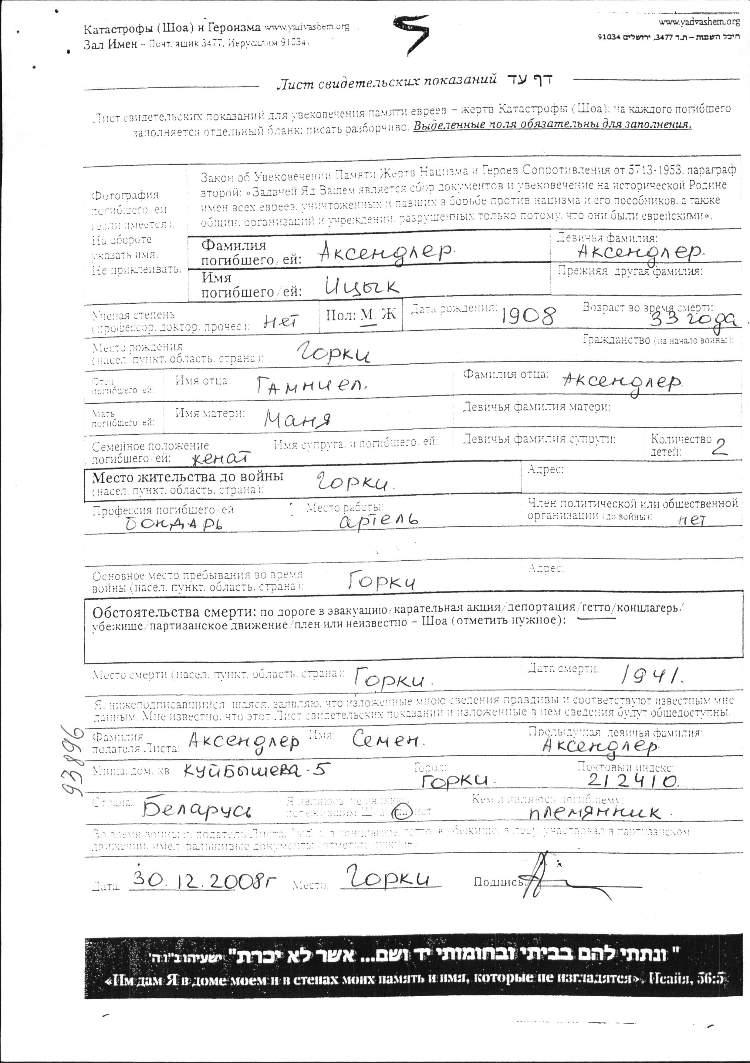 Itzyk Aksendler est né à Gorki, Bélorussie (URSS) en 1908, fils de Gamniel et de Manya. Il était Tonnelier et Marié. Avant la seconde guerre mondiale il vivait à Gorki, Bélorussie (URSS). Au cours de la guerre, il était à Ghetto.
