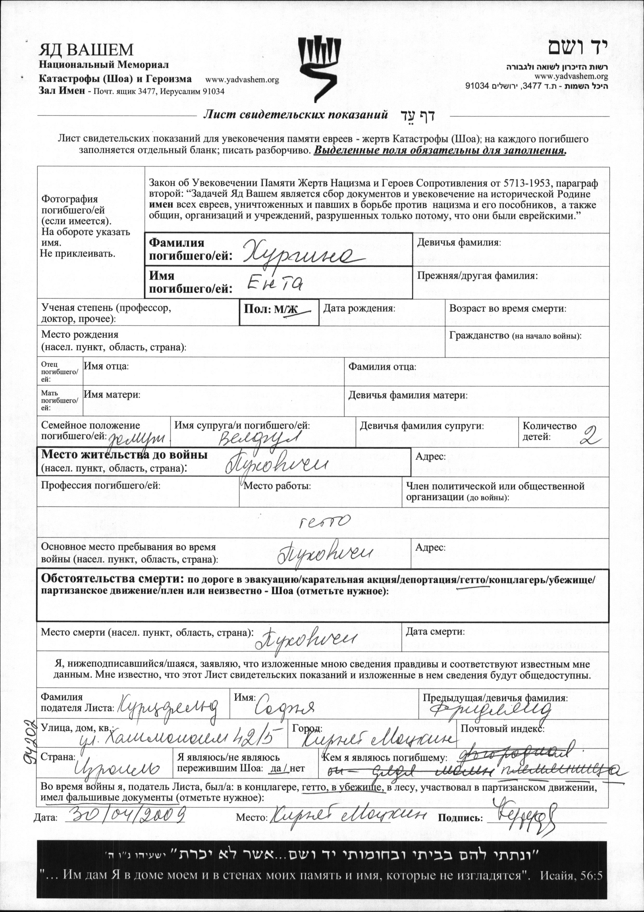 Khurgina Yenta Pukhovichi, Bélorussie (URSS) Feuille de témoignage
