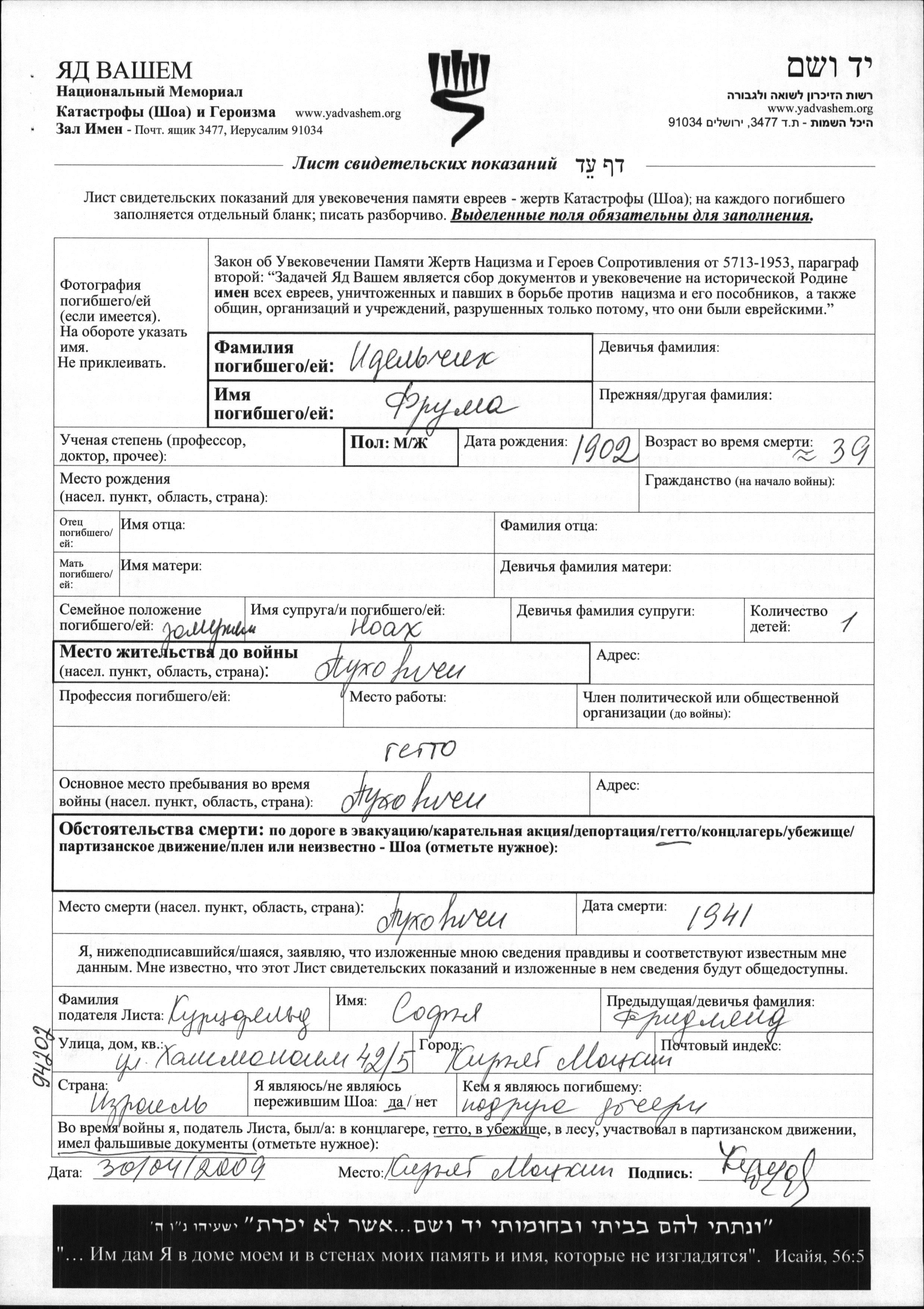 Idelchik Fruma 1902 Pukhovichi, Bélorussie (URSS) Feuille de témoignage