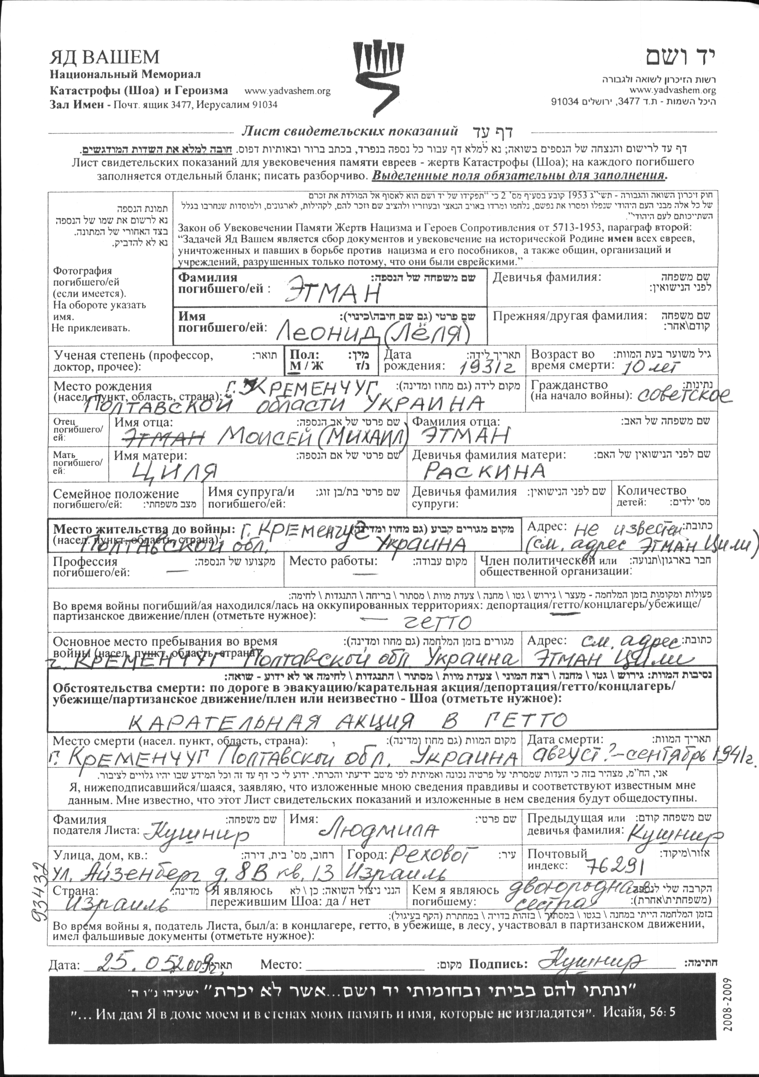 Etman Leonid Lyolya 1931 Kremenchug, Ukraine (URSS) Feuille de témoignage