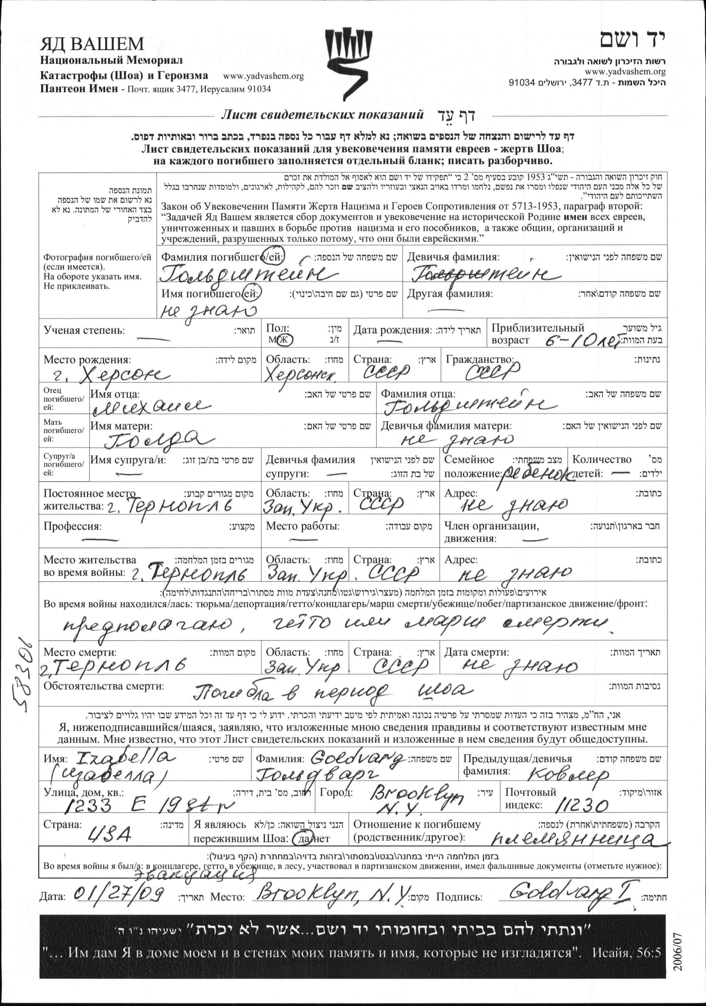 Goldshtein prénom inconnu Ternopol, Pologne Feuille de témoignage