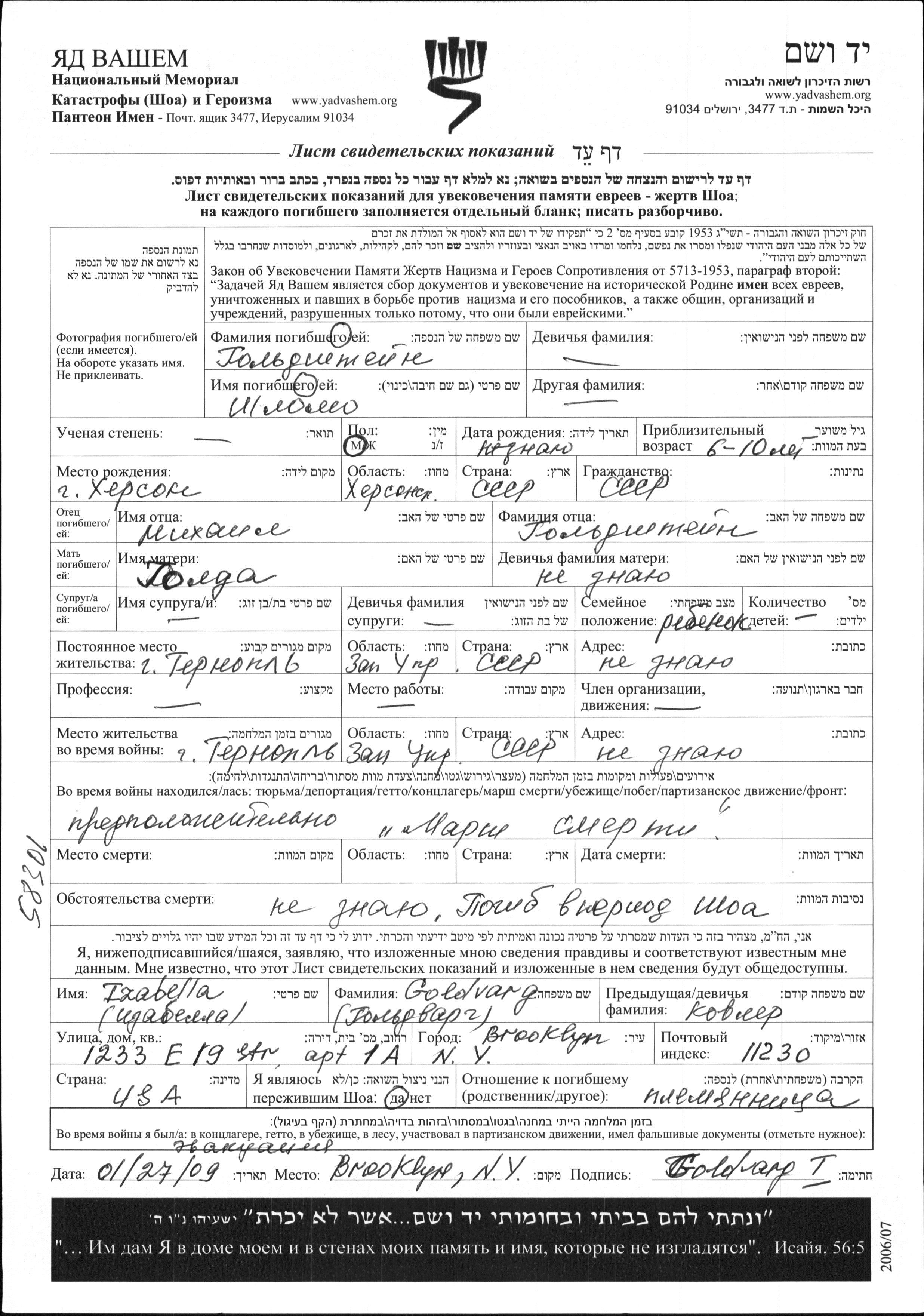 Goldshtein Shlomo Ternopol, Pologne Feuille de témoignage