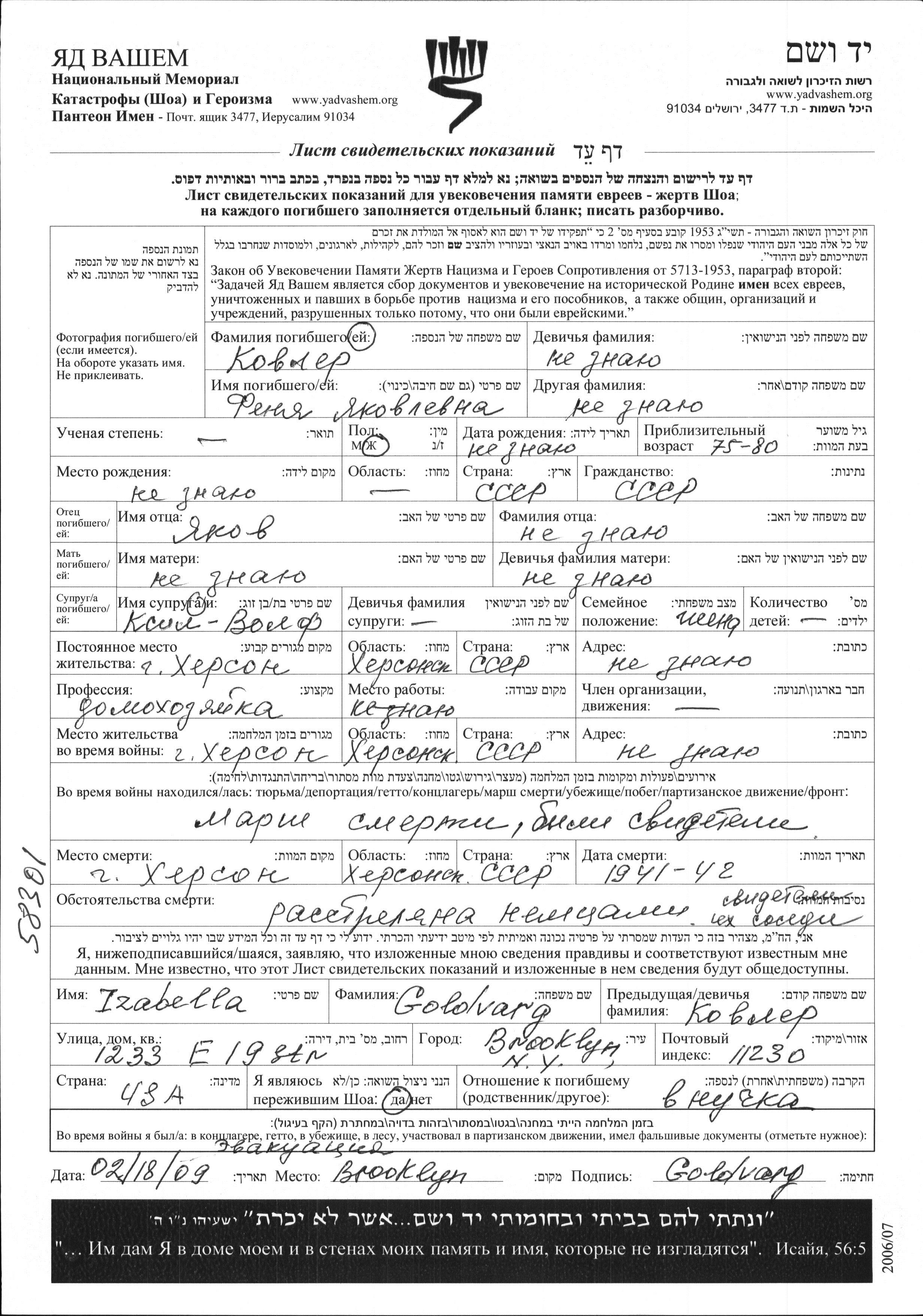 Fenya Kovler est née fille de Yakov. Elle était Femme au foyer et Mariée à Ksil Volf. Avant la seconde guerre mondiale elle vivait à Kherson, Ukraine (URSS). Pendant la guerre, elle était à Kherson, Ukraine (URSS).