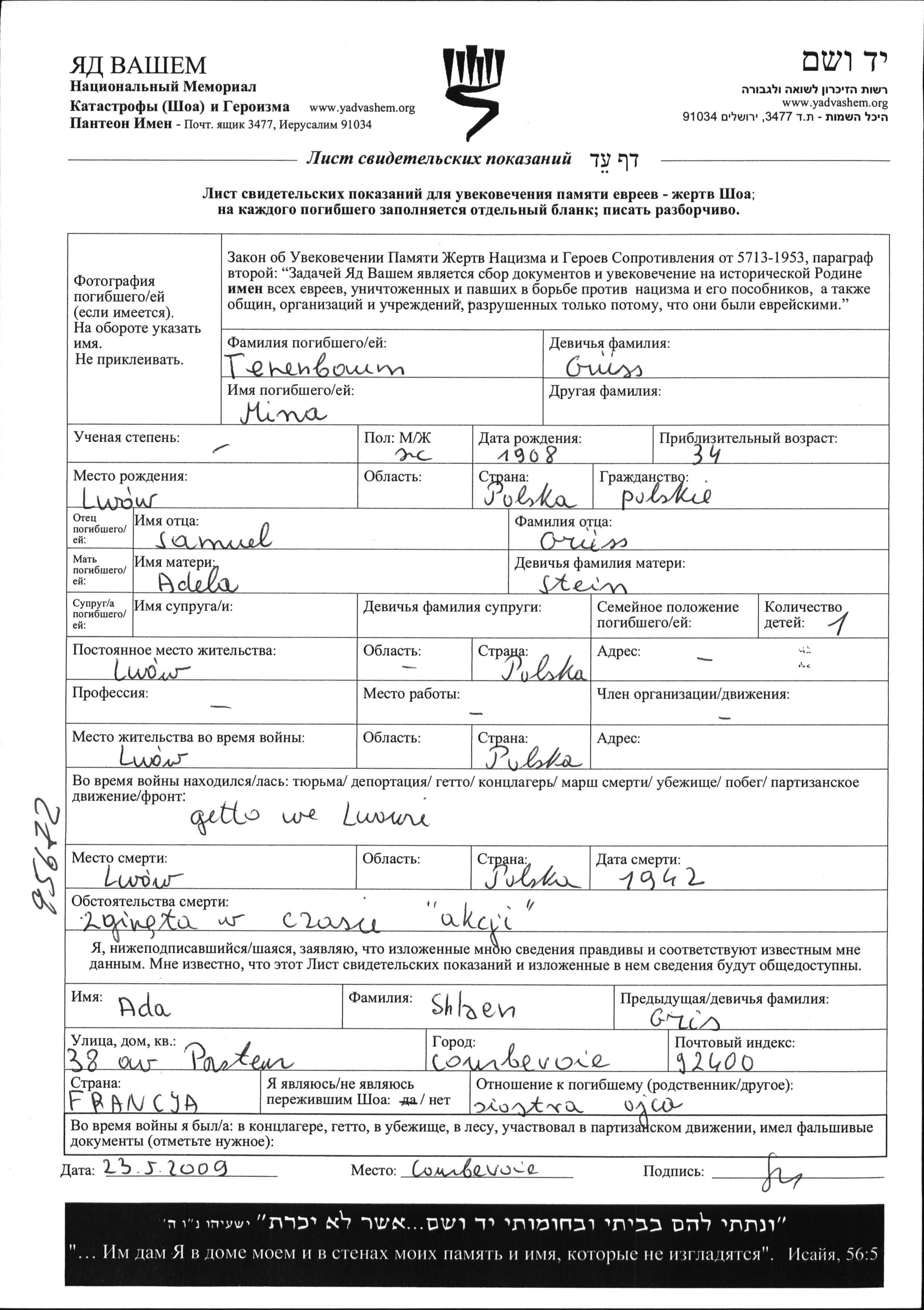 Tenenbaum Mina 1908 Lwow, Pologne Feuille de témoignage