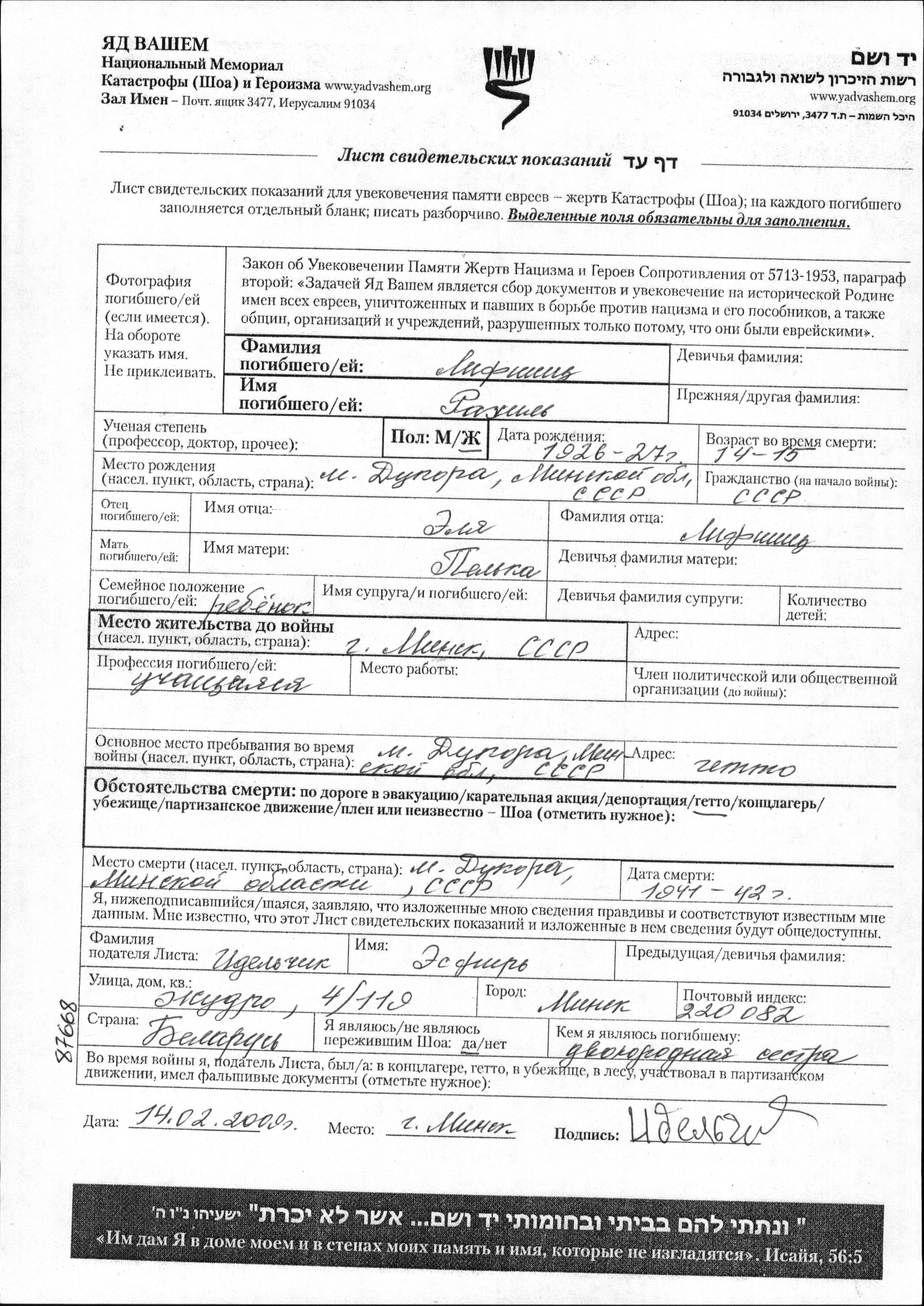 Lifshitz Rakhil 1926 Minsk, Bélorussie (URSS) Feuille de témoignage