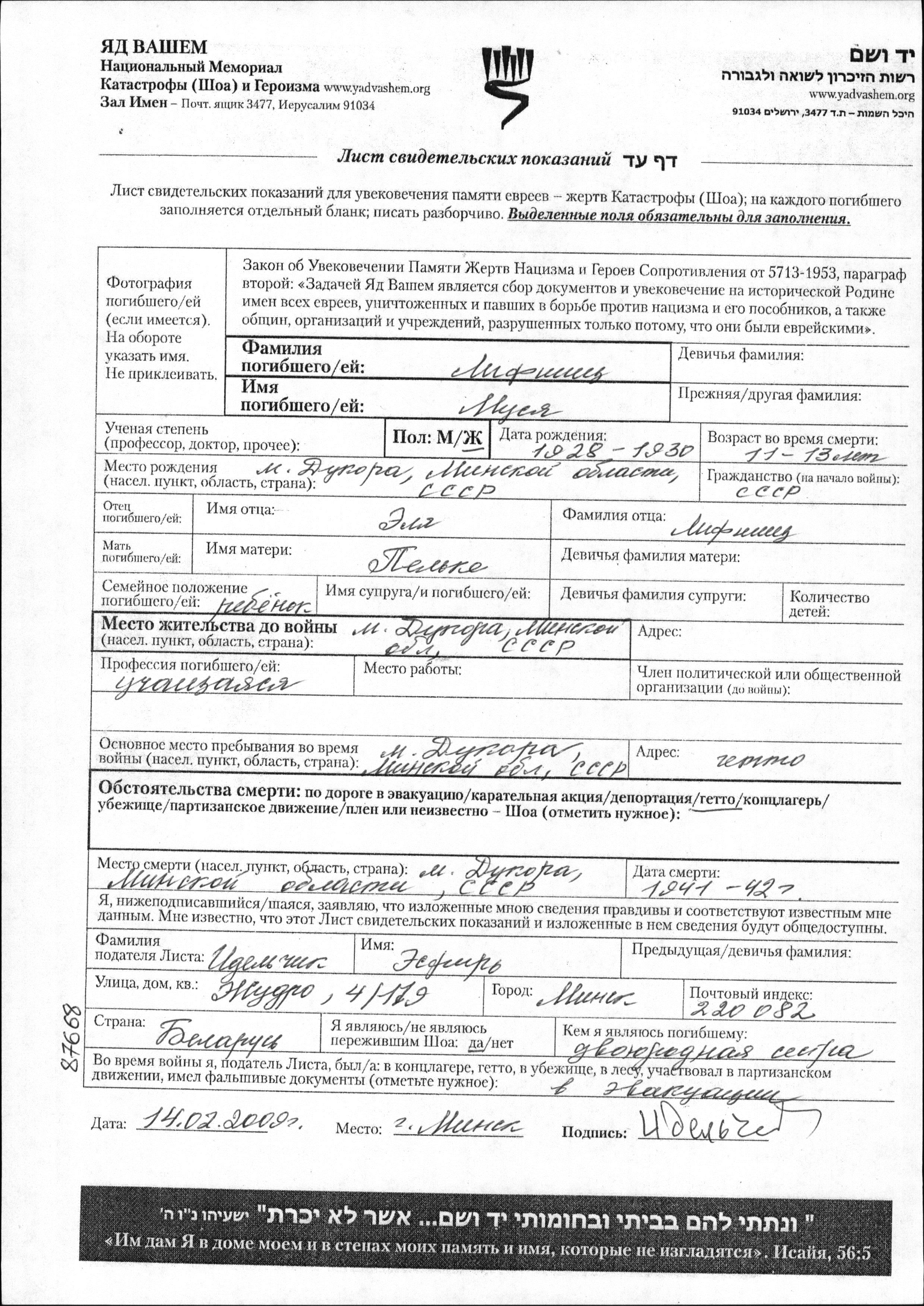 Musya a été assassinée pendant la Shoah. Lieu de la mort: Dukora, Bélorussie (URSS) en 1941.