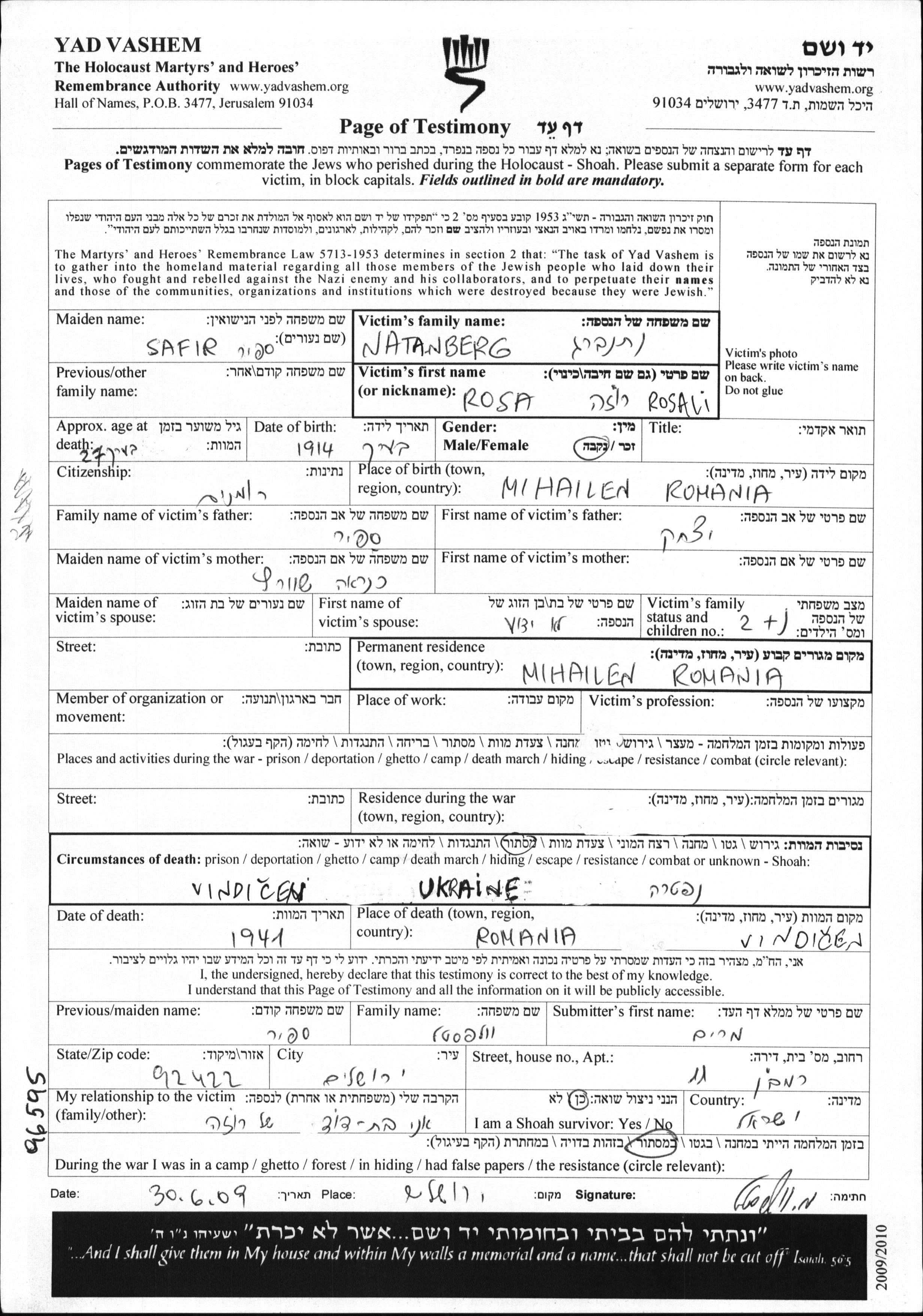 Natanberg Rosa 1914 Mihaileni, Roumanie Feuille de témoignage