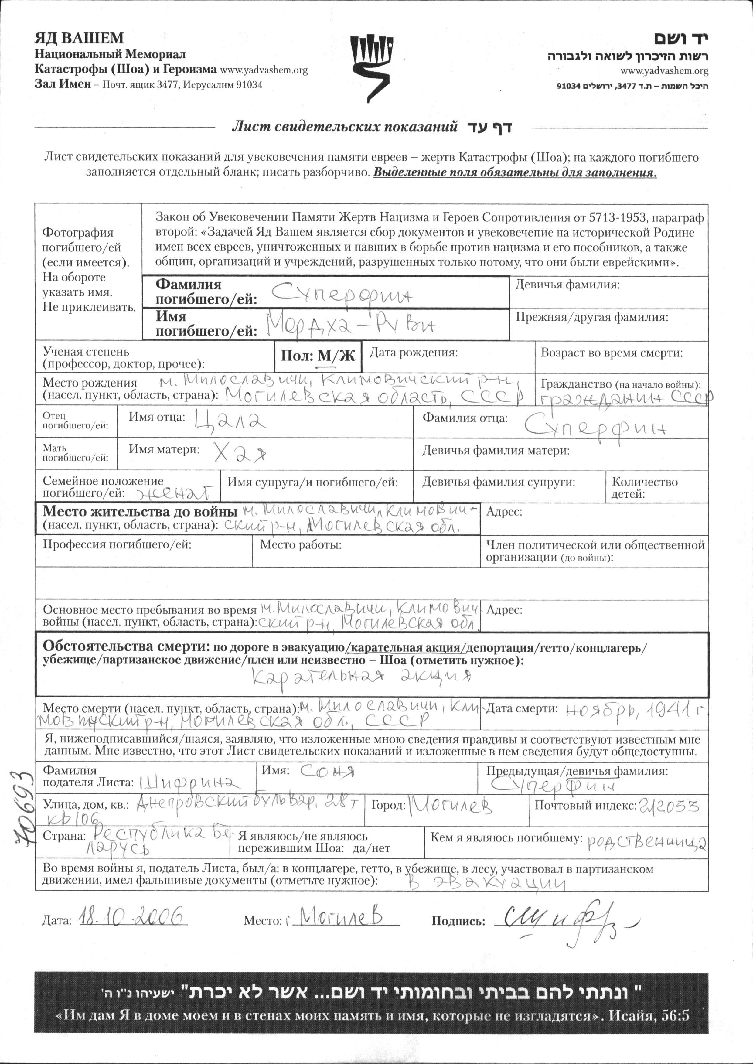 Superfin Mordkha Ruvn Miloslavichi, Bélorussie (URSS) Feuille de témoignage